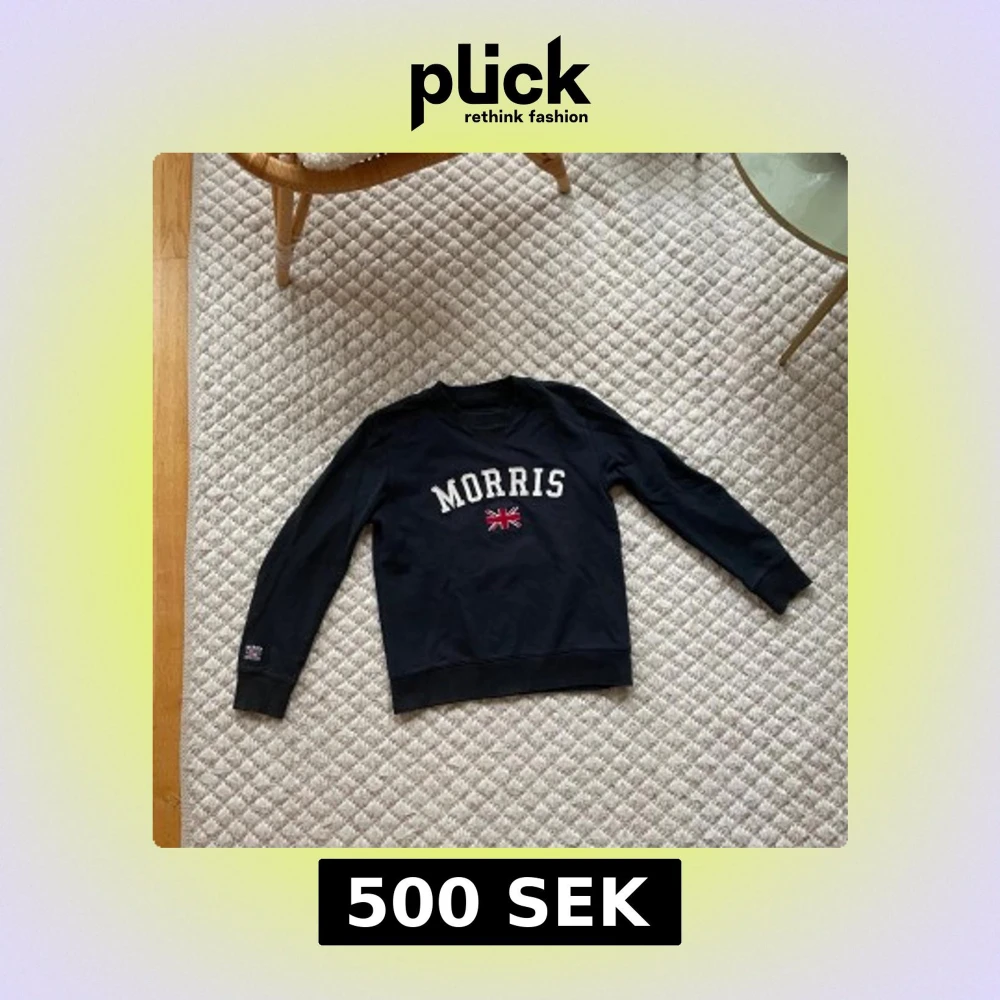 Säljer en mörkblå tröja från Morris med vit text och en liten brittisk flagga på bröstet. Tröjan har långa ärmar och en klassisk rund halsringning. Perfekt för en stilren och avslappnad look.
