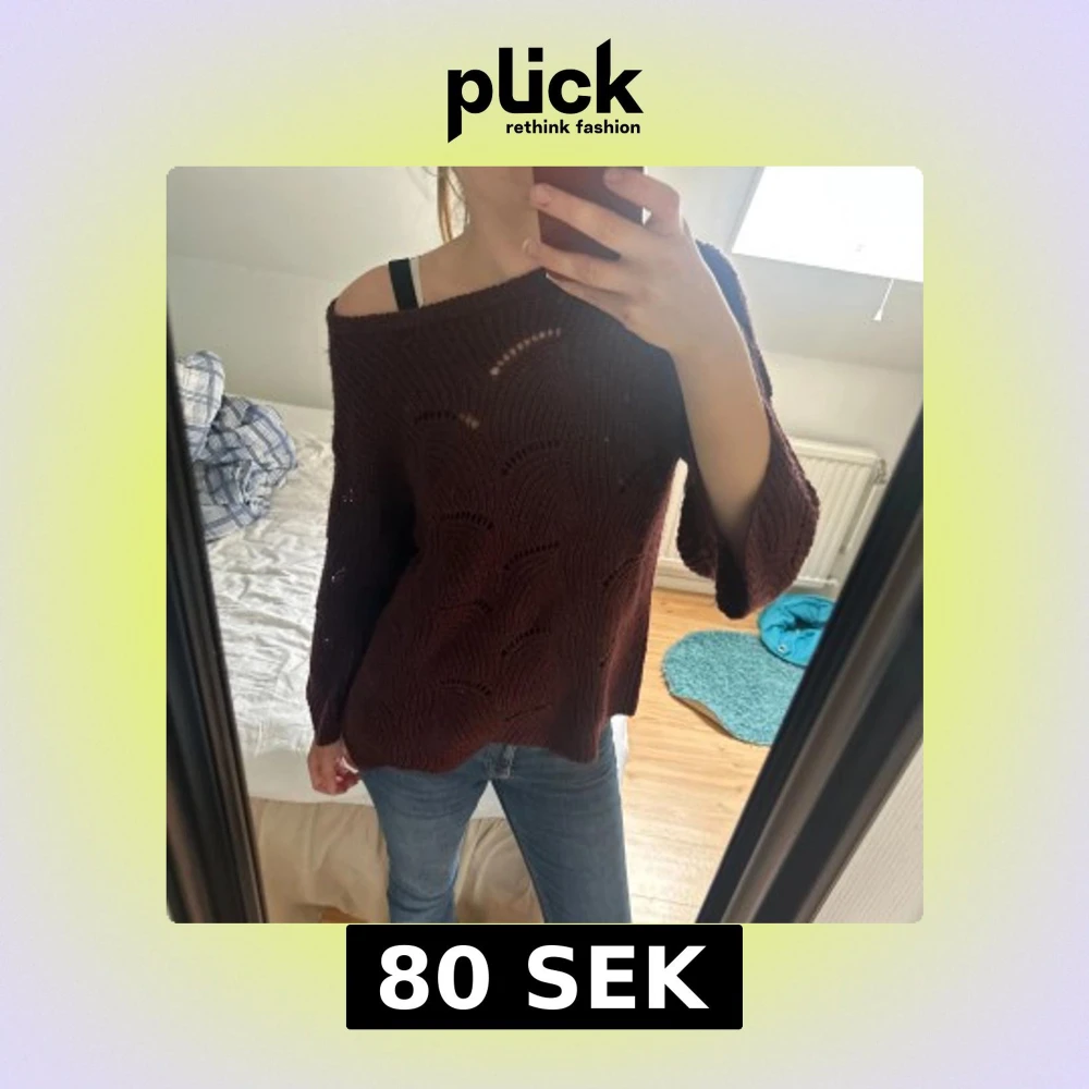 Säljer en mörk vinröd stickad tröja med offshoulder-look och snyggt hålmönster.