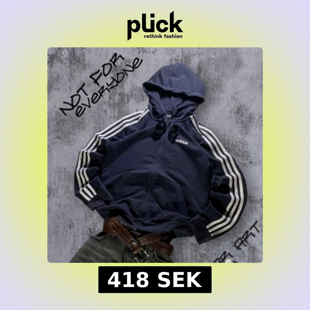 Säljer en mörkblå Adidas hoodie med klassiska vita ränder längs ärmarna och Adidas-logga på bröstet. Tröjan har huva med snörning, dragkedja framtill och två stora fickor. Perfekt för chill dagar eller när du vill ha en sportig vibe.