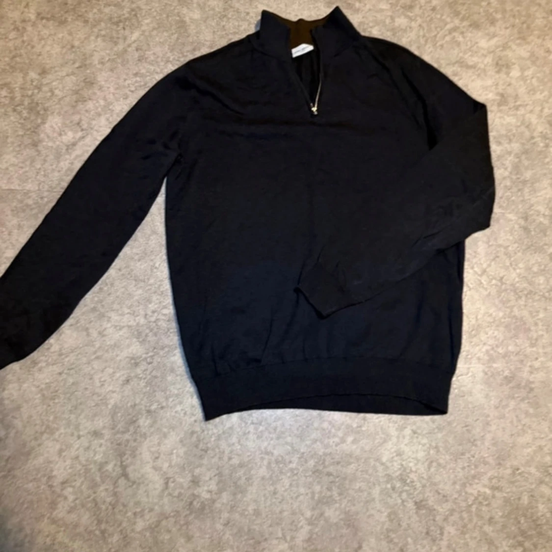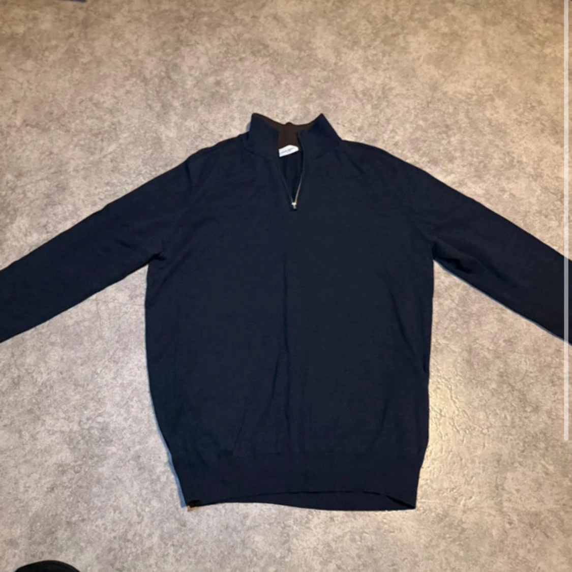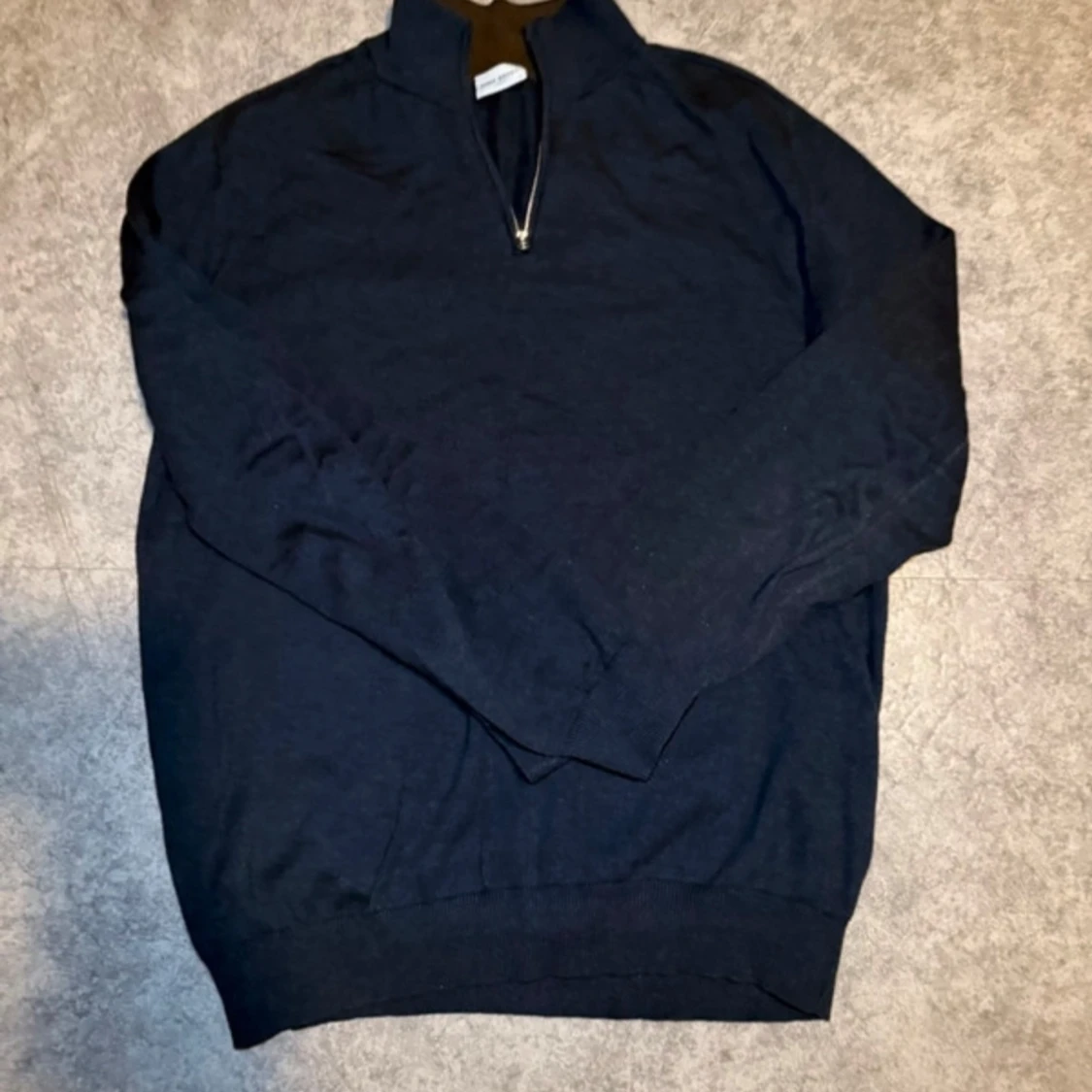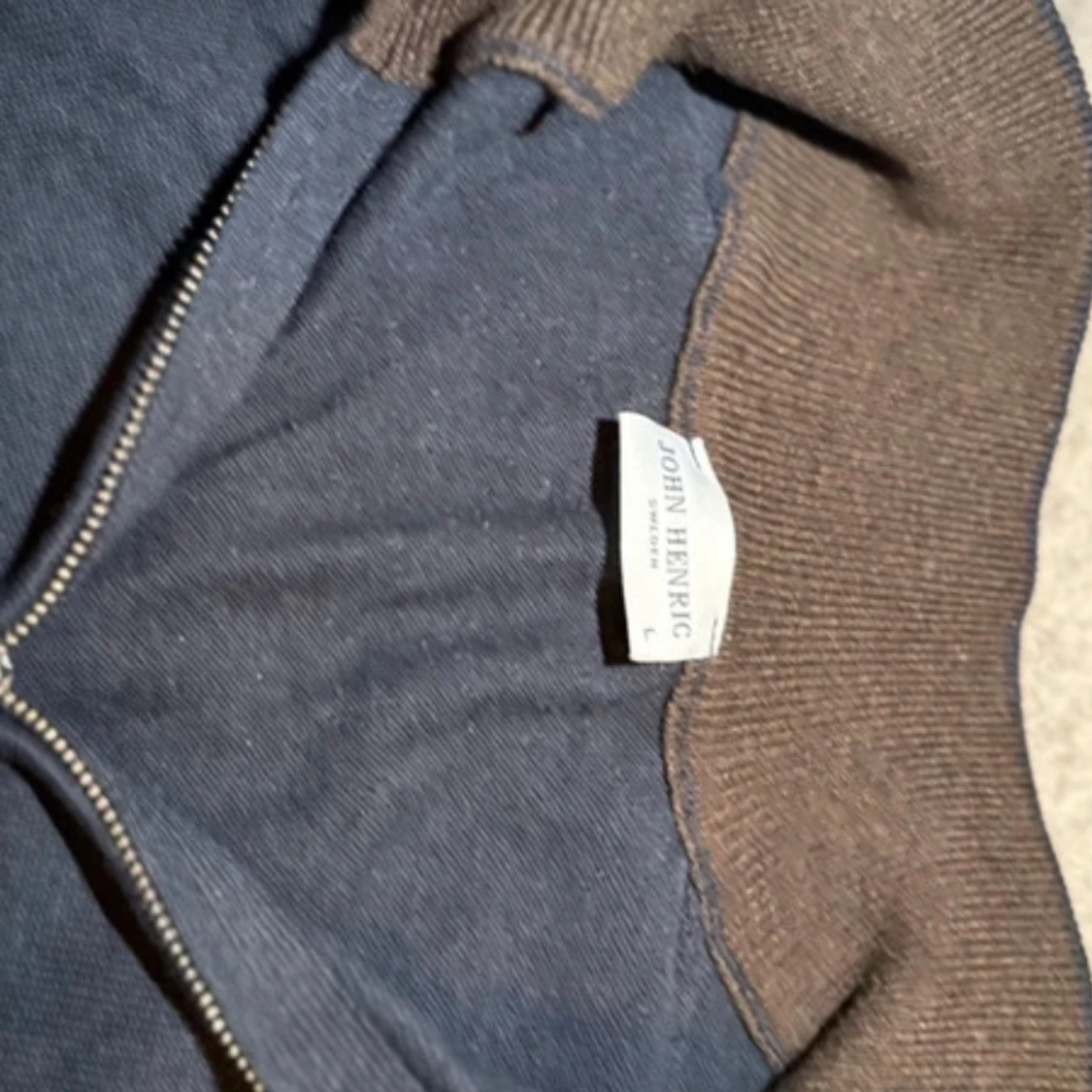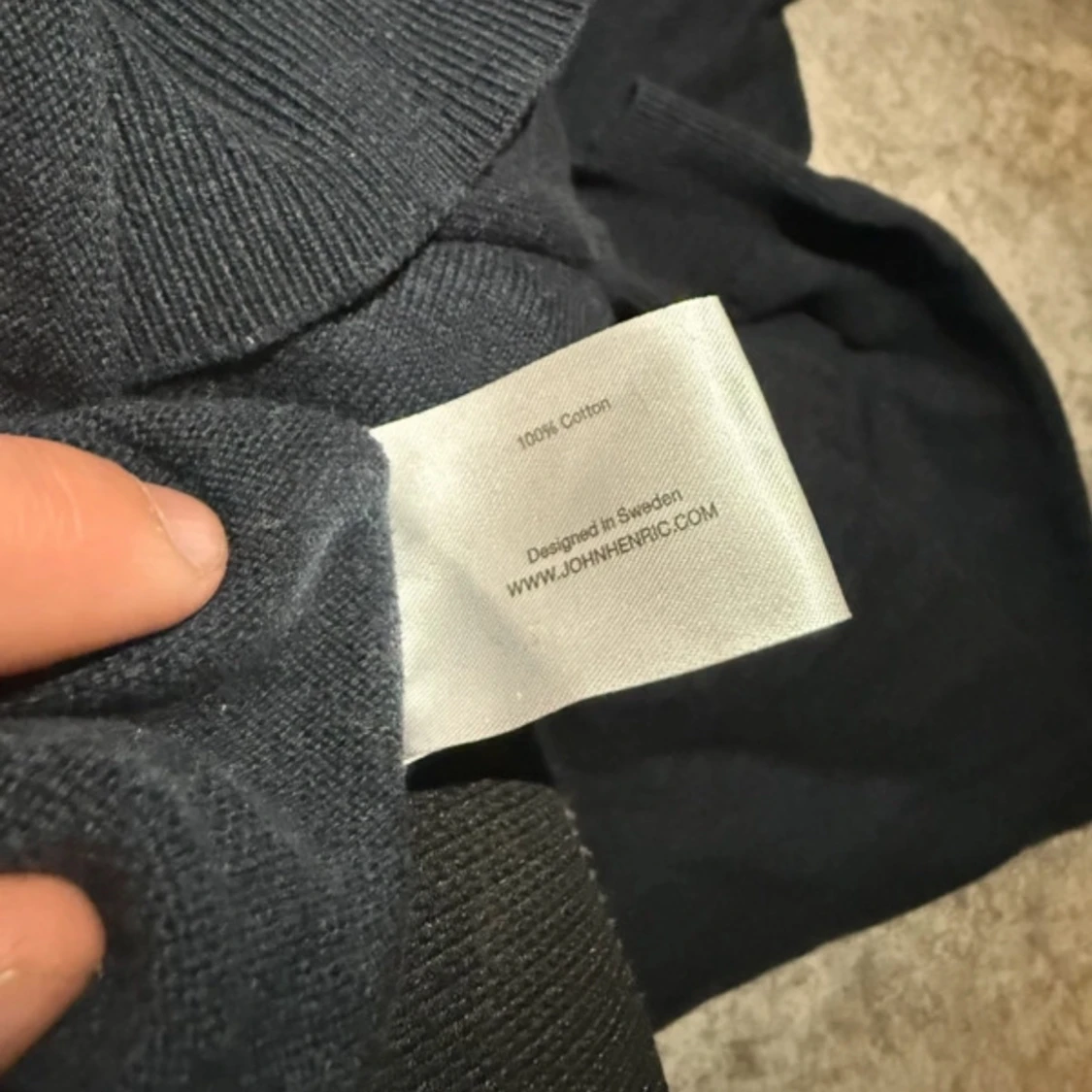 Säljer en stilren mörkblå tröja från John Henric i 100% bomull. Tröjan har en dragkedja vid halsen och ribbade muddar vid ärmslut och nederkant. Perfekt för en avslappnad men snygg look.