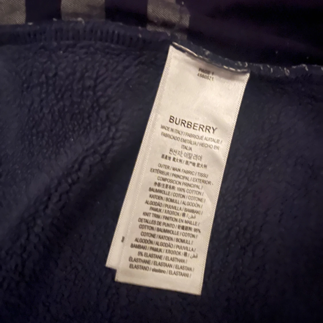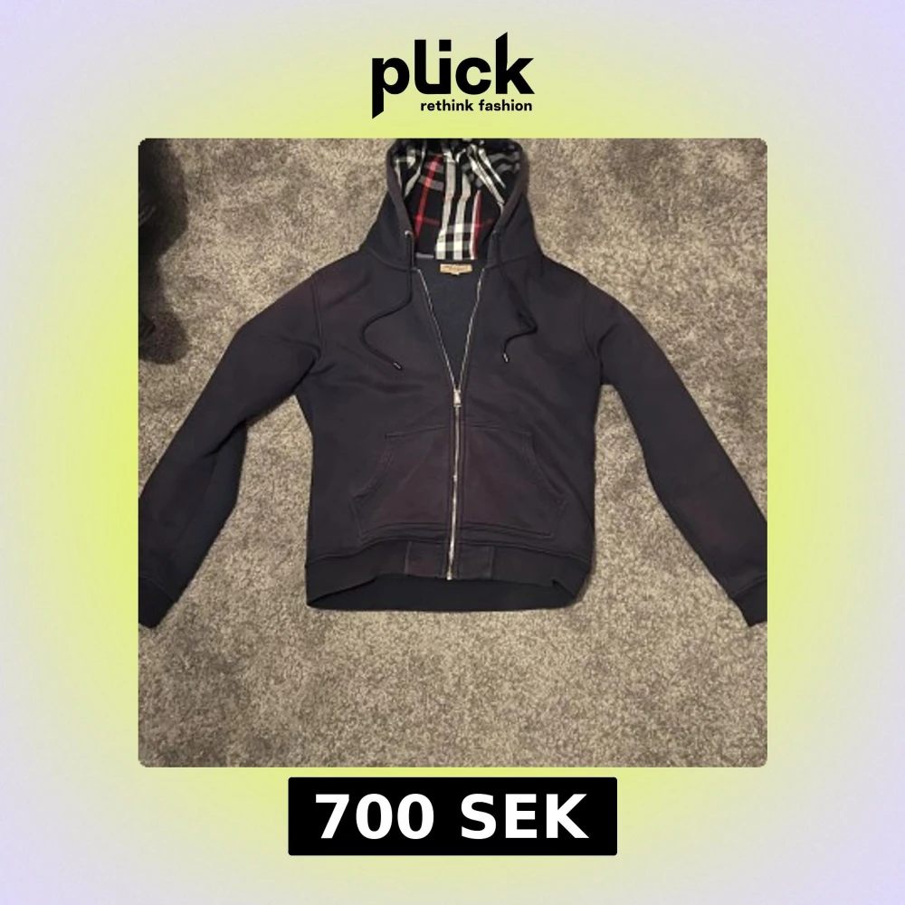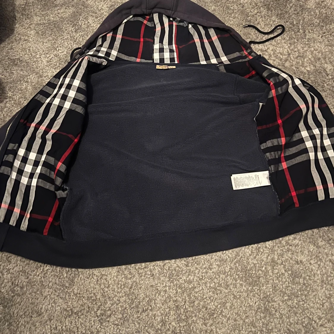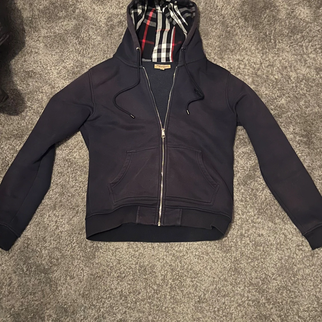 Snygg mörkblå hoodie från Burberry med klassiskt rutigt foder i huvan och broderad logga på bröstet. Tröjan har dragkedja, snörning i huvan och känguruficka. Perfekt för dig som vill ha en stilren och lyxig look.