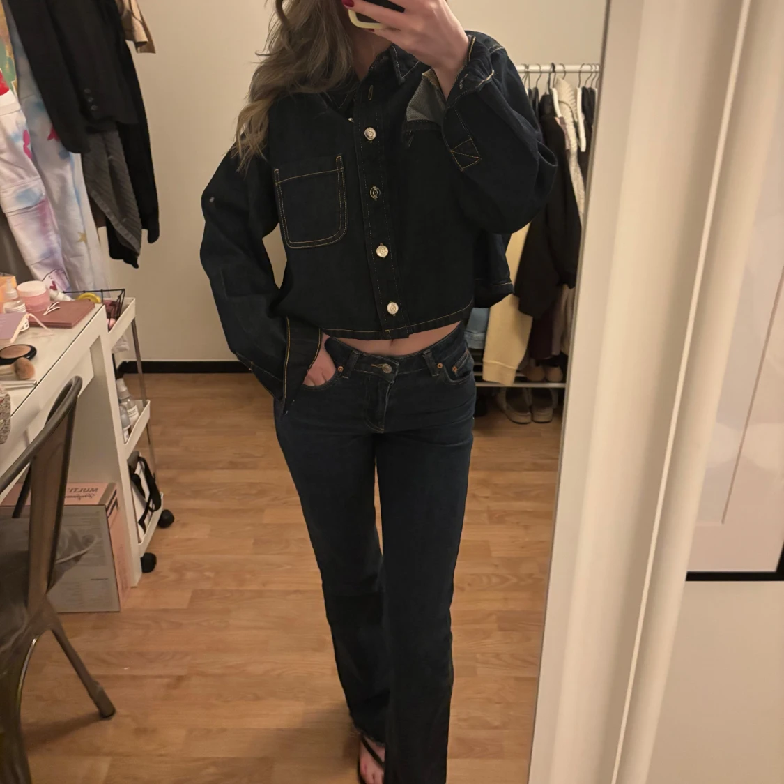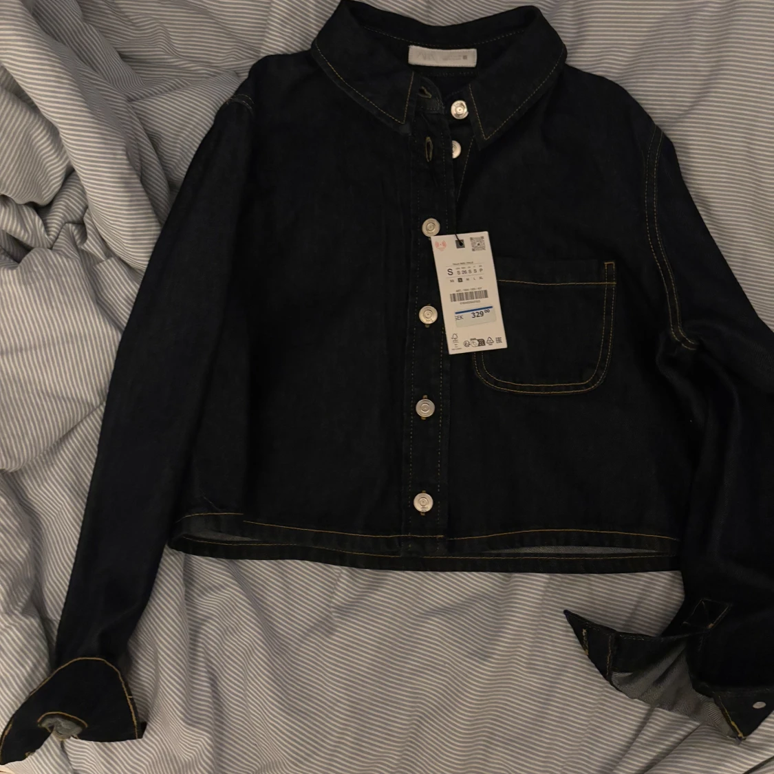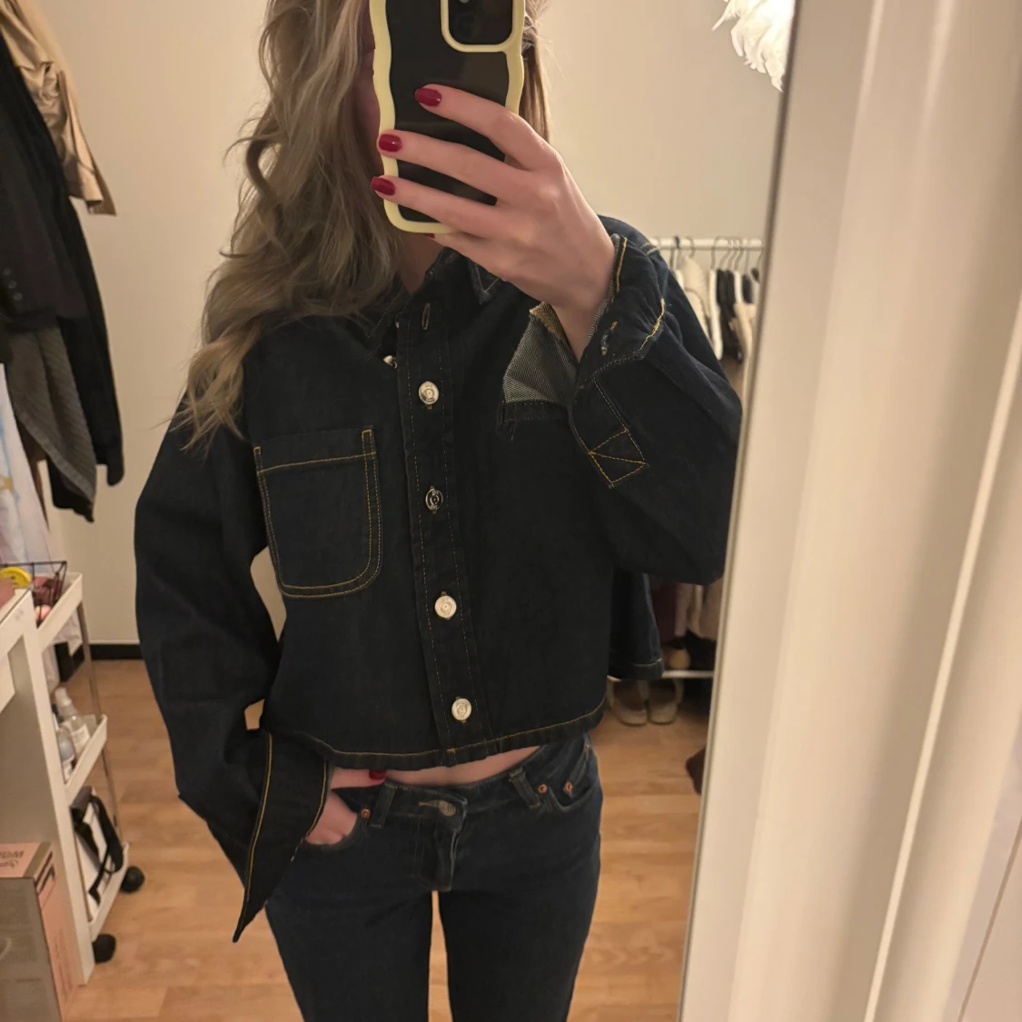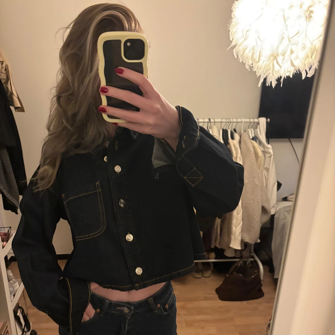 Säljer en mörkblå croppad jeansjacka/tröja. Jackan har en stor bröstficka och klassisk krage. Passformen är oversized och ärmarna är långa. Perfekt för dig som gillar en trendig och avslappnad stil. Perfekt till en utekväll, sommarkväll eller till vardags. Aldrig använd med prislapp kvar då jag har en liknande