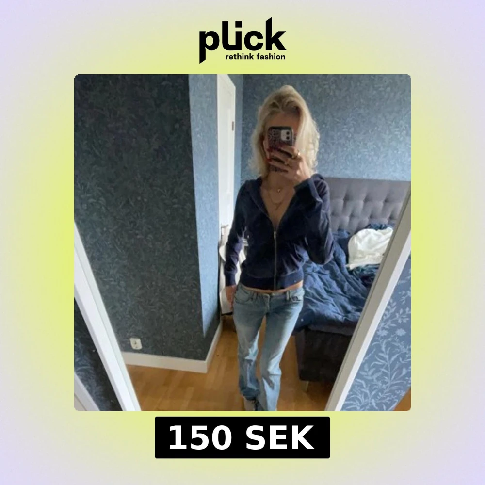 Säljer en mörkblå hoodie med dragkedja och långa ärmar. Perfekt för en avslappnad stil. Den har en enkel design utan mönster och är gjord i ett mjukt material. Intorkad limfläck på baksida arm, skriv för bild.