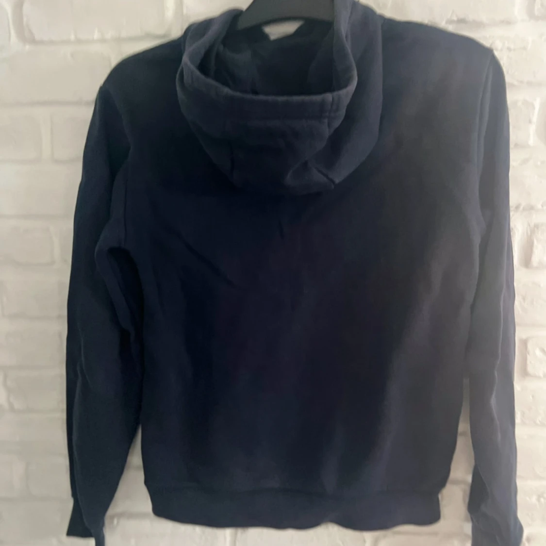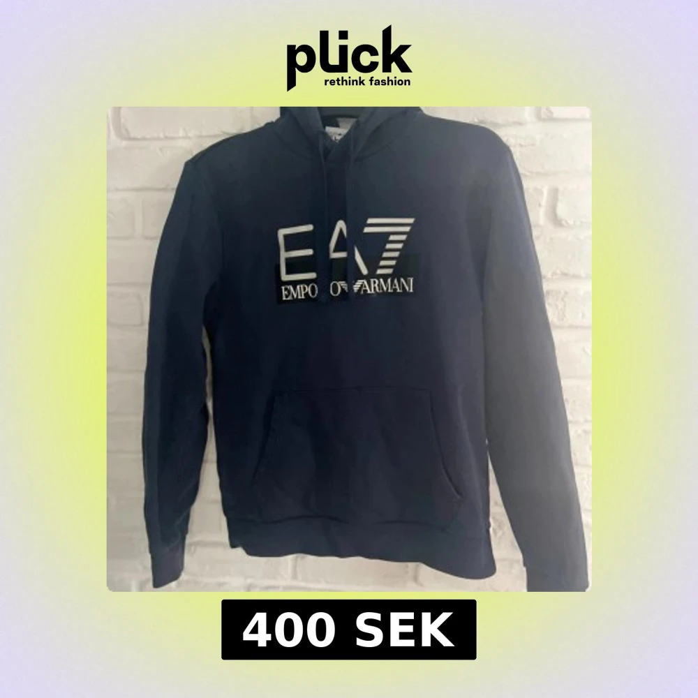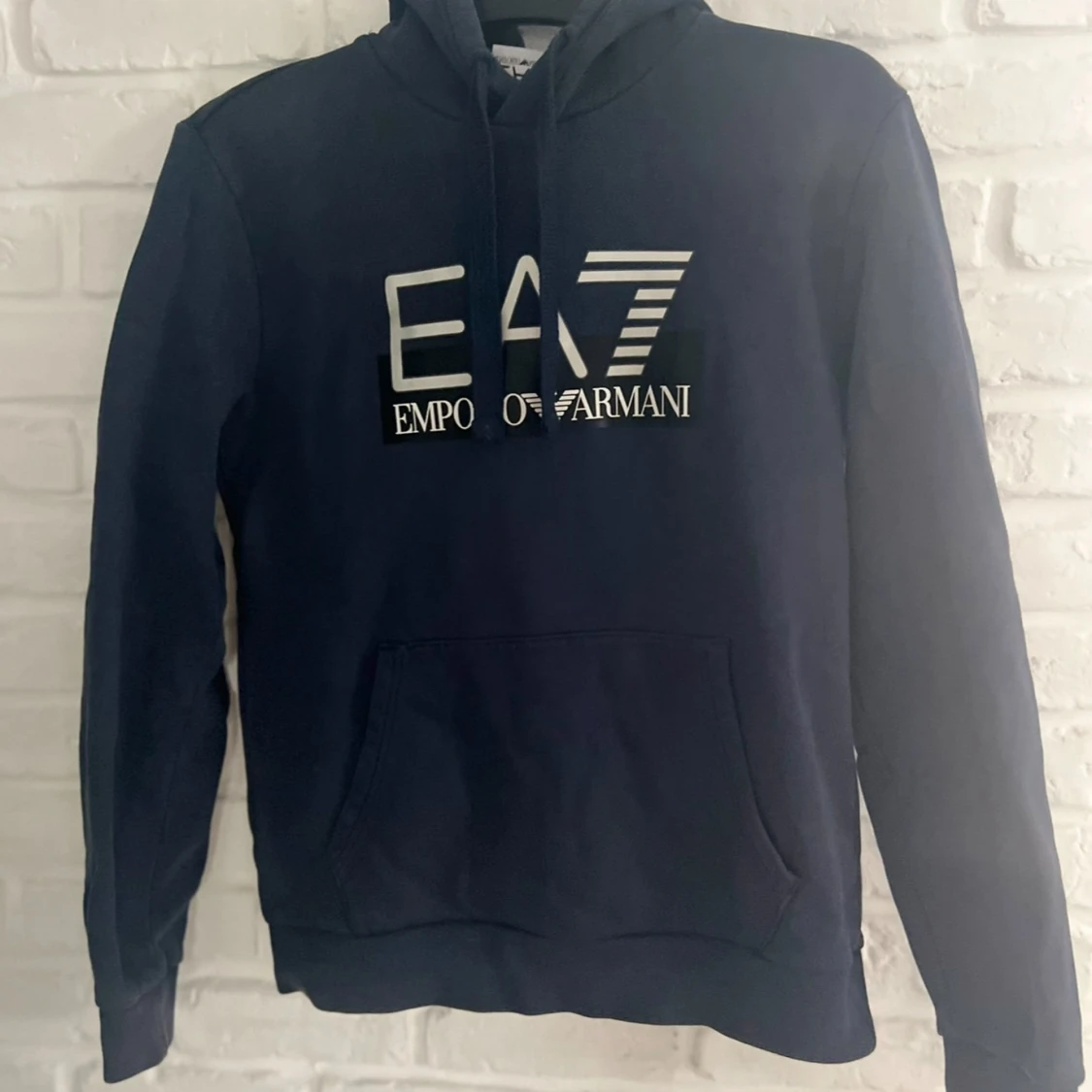 Snygg mörkblå hoodie från EA7 Emporio Armani med stor vit logga framtill står ingen storlek på men den bär storlek 168-175 så de är storlek S