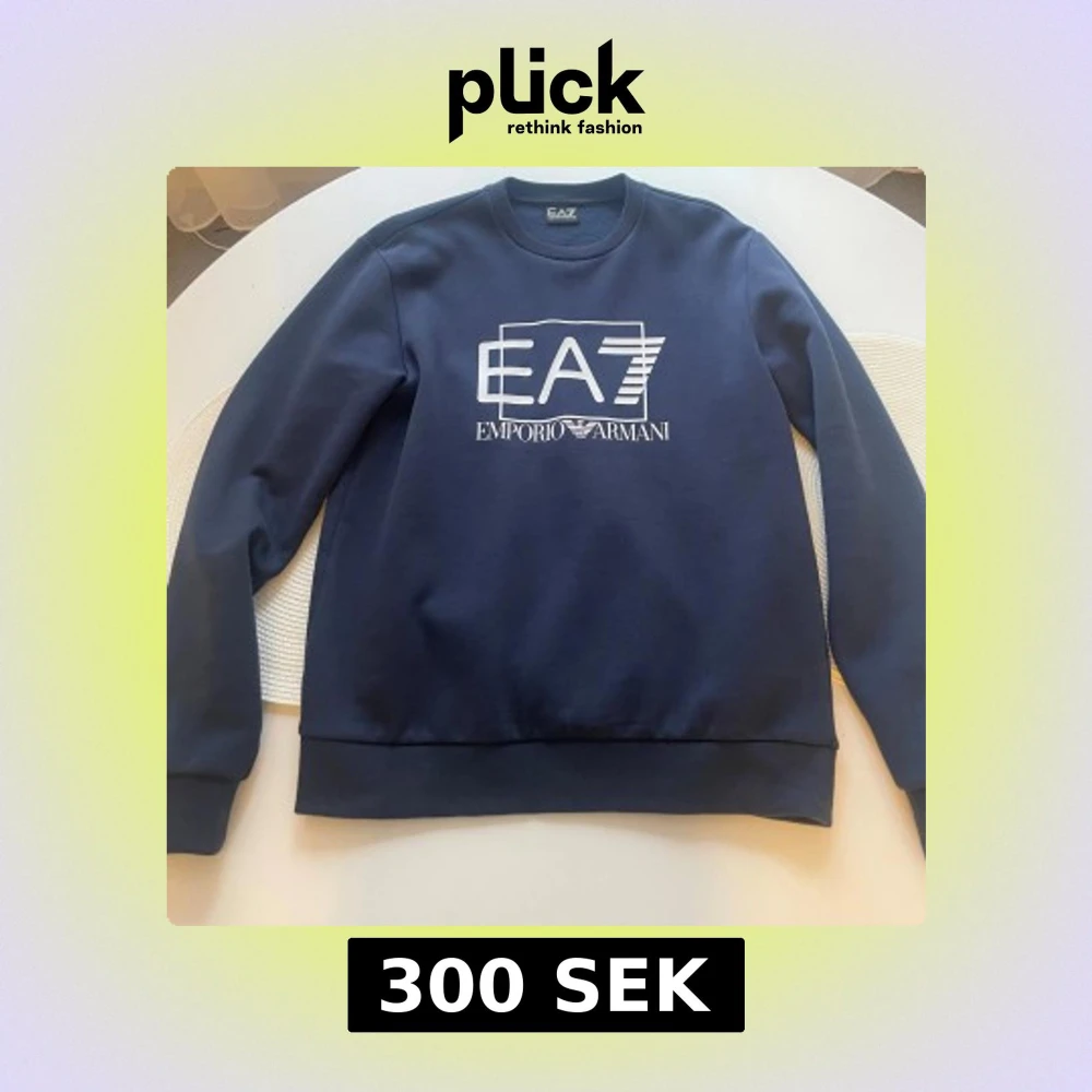 Snygg mörkblå sweatshirt från EA7 Emporio Armani med stort vitt logotryck på bröstet. Tröjan har rund hals, långa ärmar och ribbade muddar. Perfekt för dig som gillar stilrena och exklusiva plagg med streetkänsla.