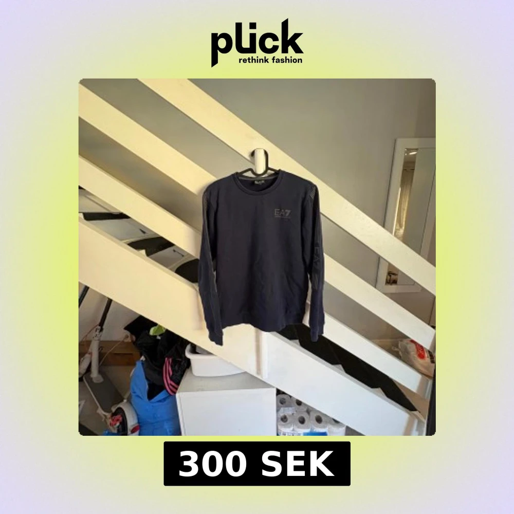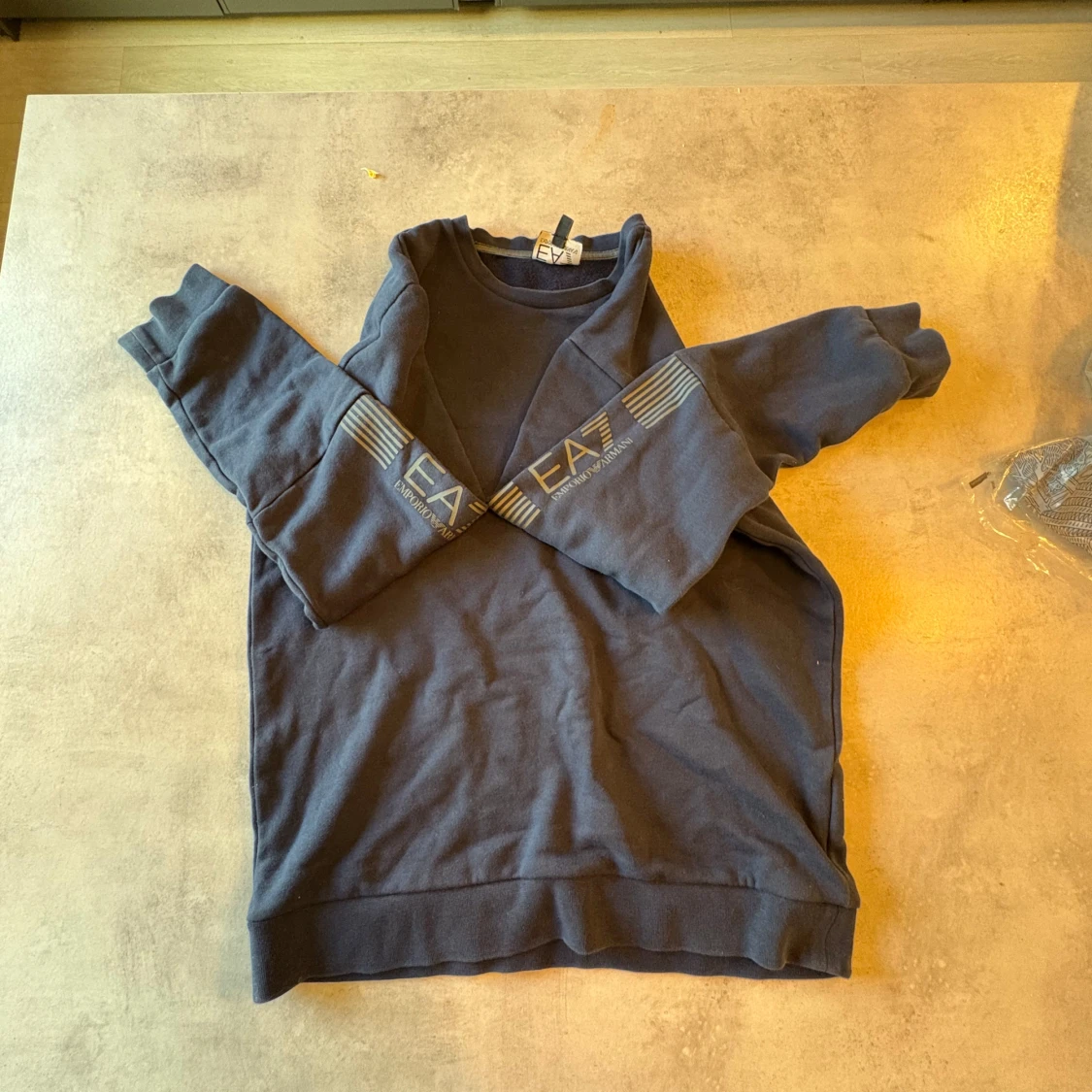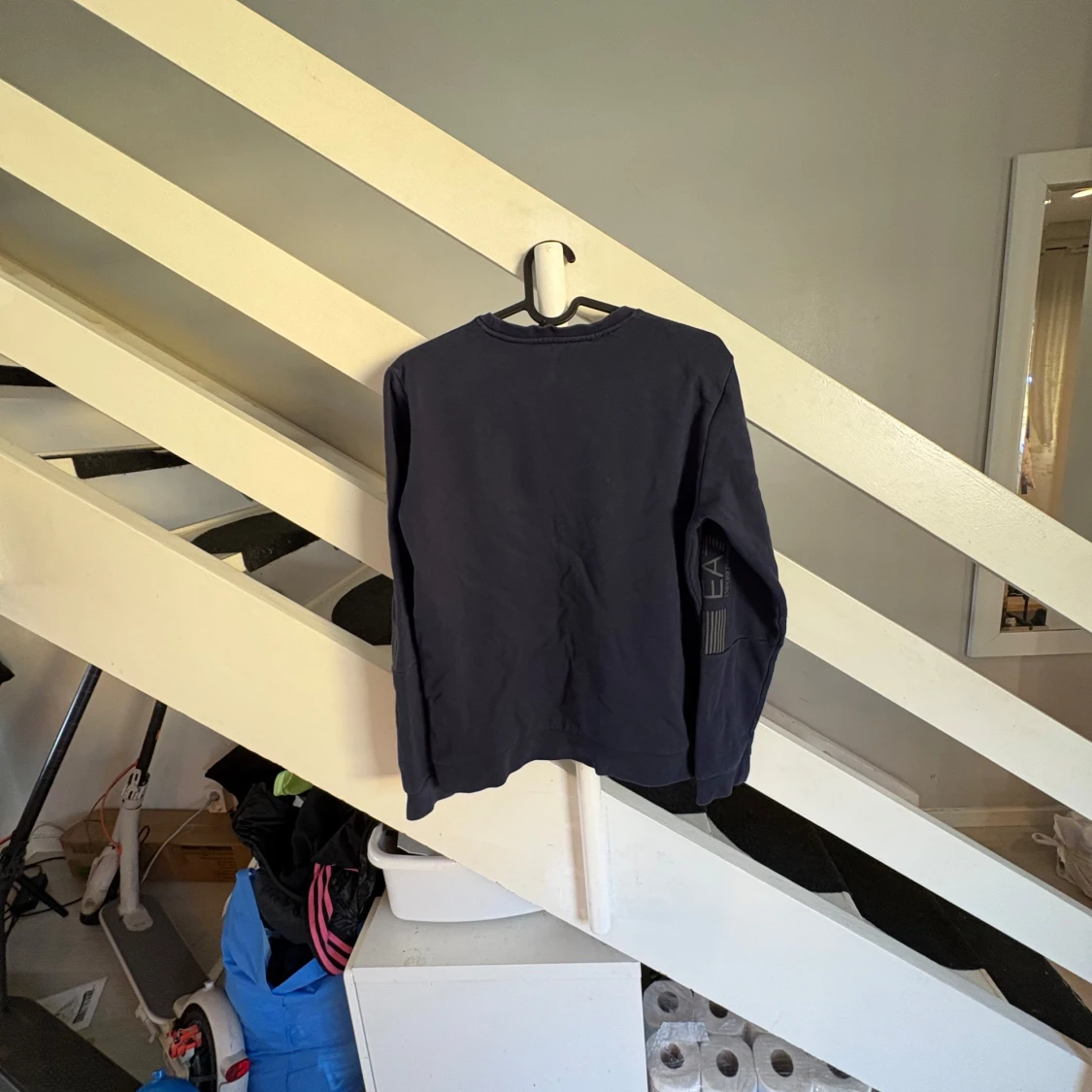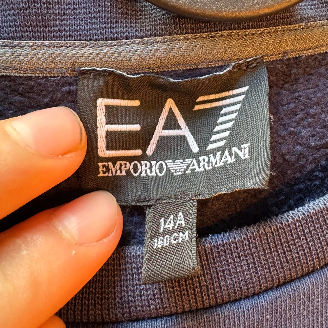 Snygg mörkblå tröja från EA7 Emporio Armani med tryck på bröstet och ärmarna. Tröjan har rund halsringning och långa ärmar med ribbade muddar. Perfekt för dig som gillar stilrena och sportiga plagg.