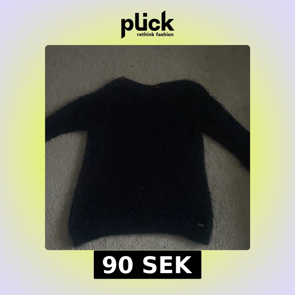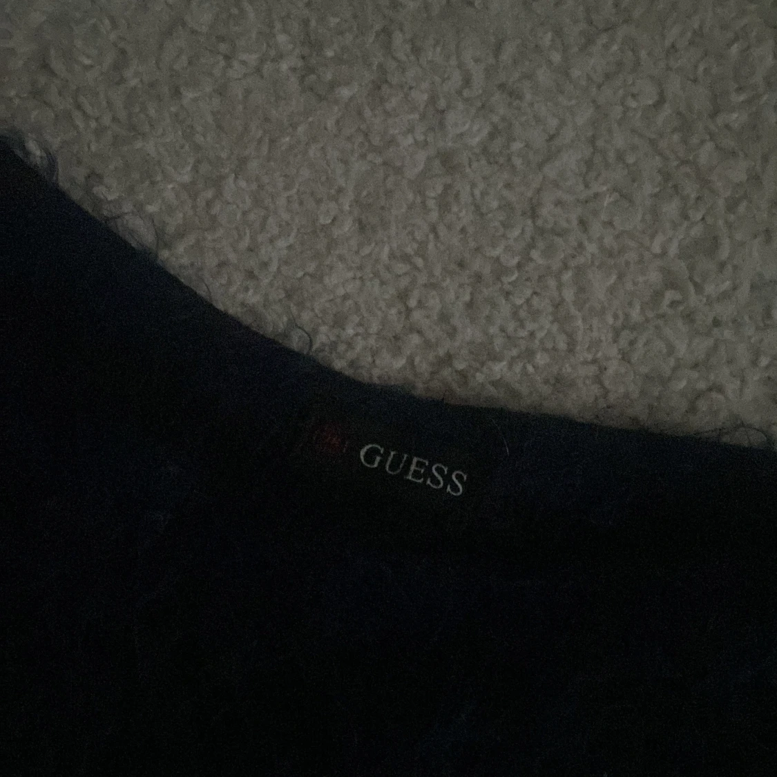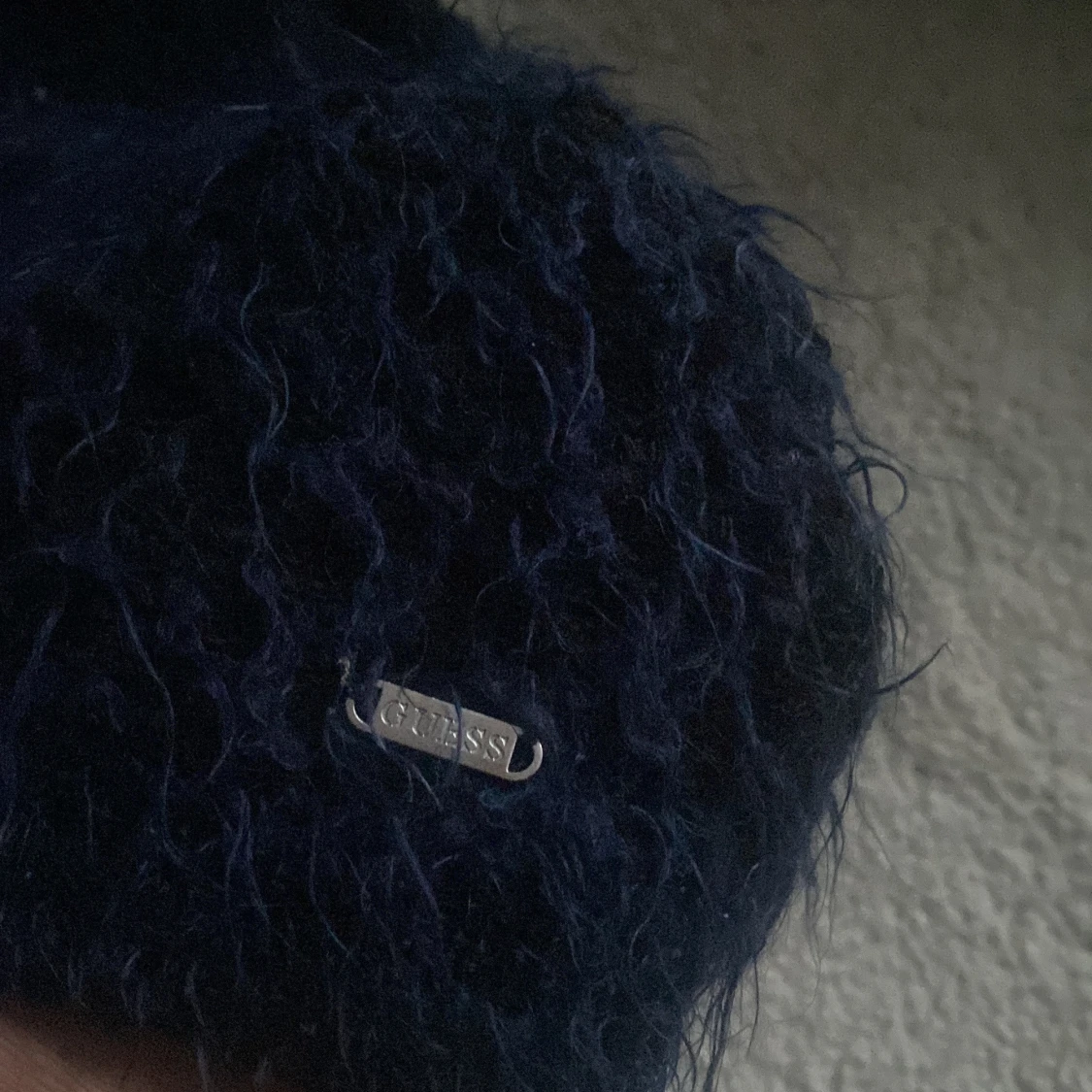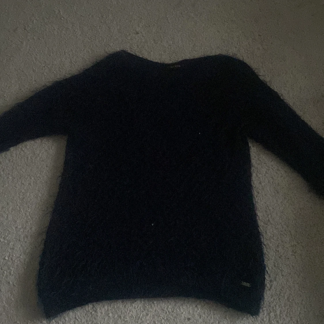 Säljer en mörkblå fluffig tröja från Guess. Säljer då den inte använd och är köpt här på plick! säljer för 40kr