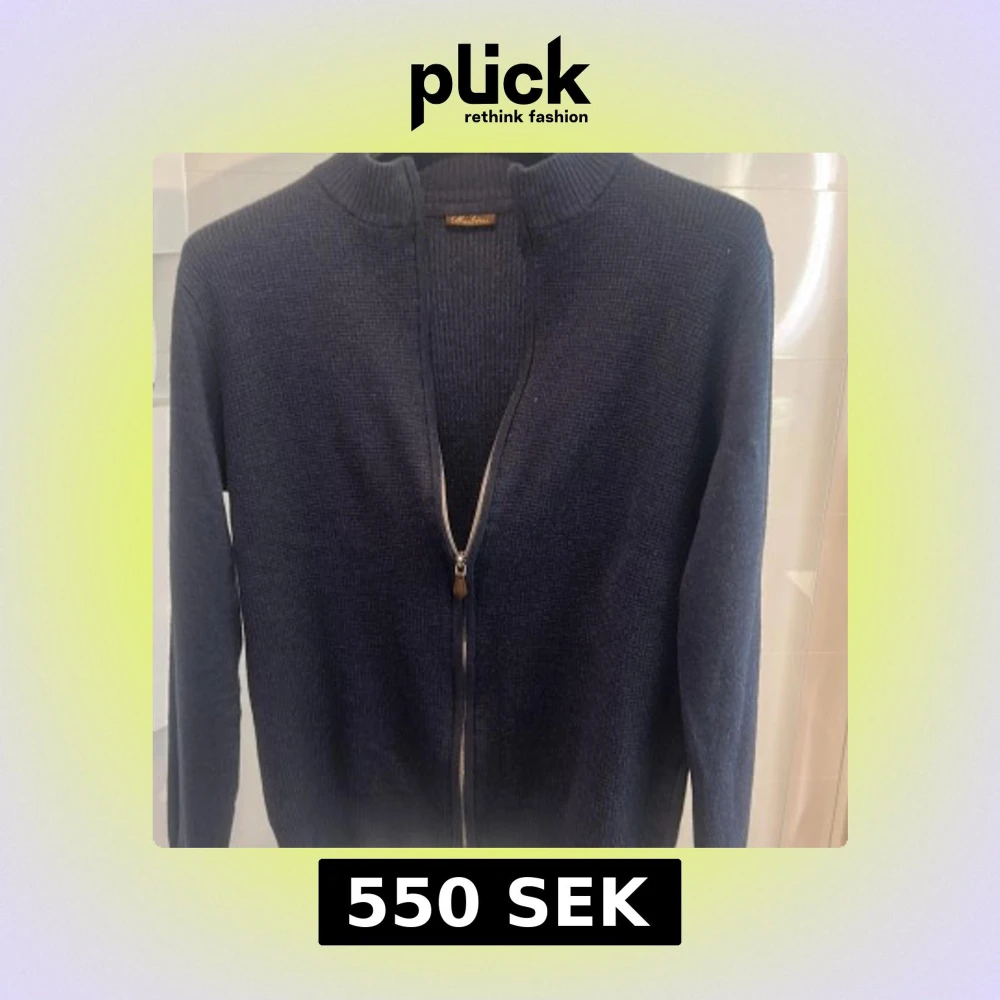 Mörkblå stickad kofta från Stenströms med hel dragkedja framtill och ribbad krage. Klassisk och stilren modell med långärmade ärmar, perfekt för lager-på-lager. Materialet känns mjukt och ger en snygg struktur. Den är storlek L men den passar storlek Medium. 100% merinoull.
