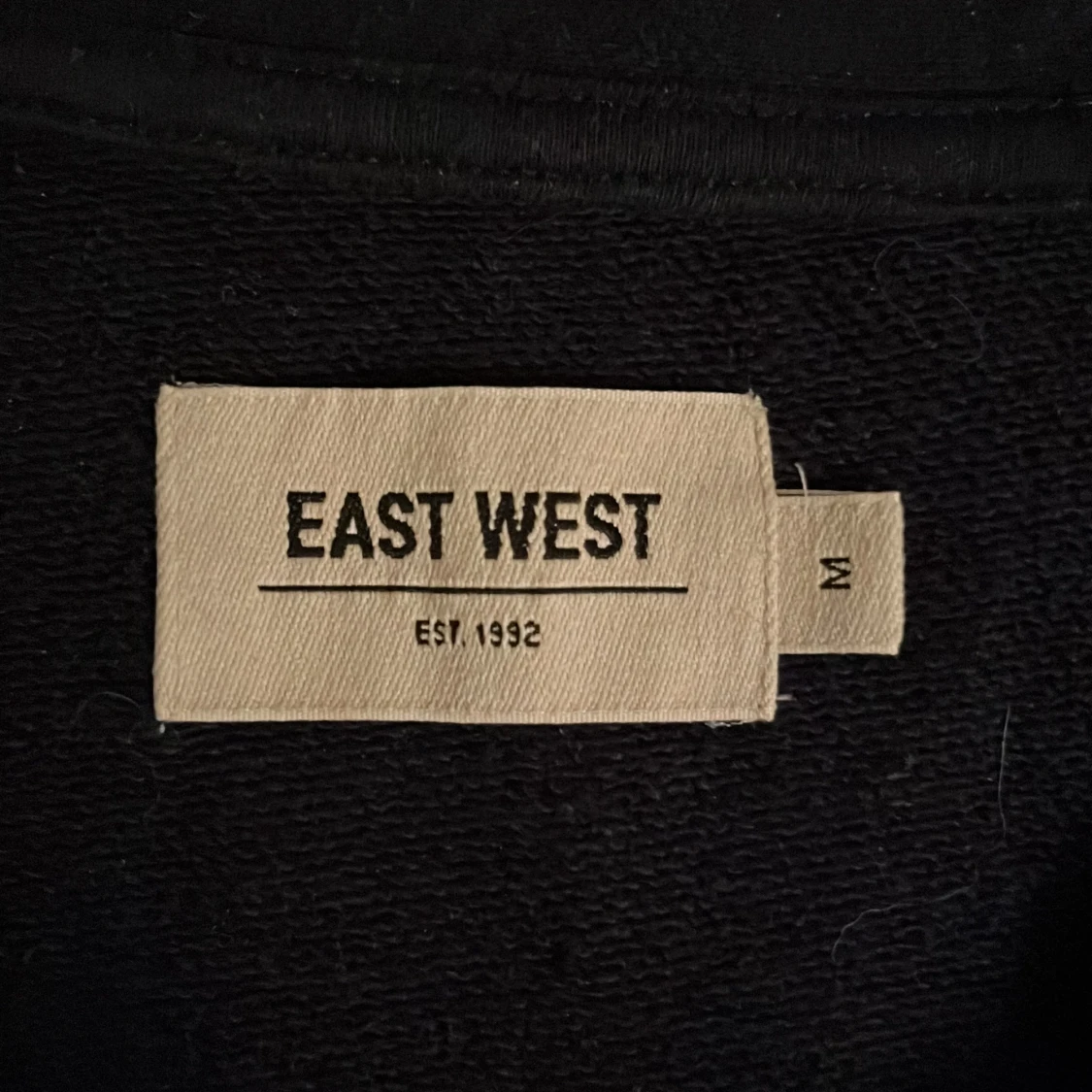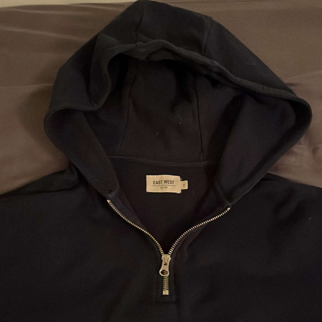 Säljer en stilren mörkblå hoodie från East West med dragkedja framtill. Perfekt för en avslappnad look. Väldigt bra skick, inga defekter. Storlek M.