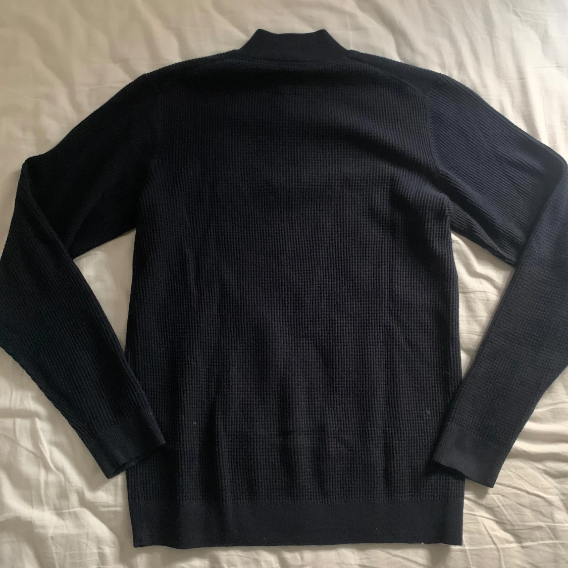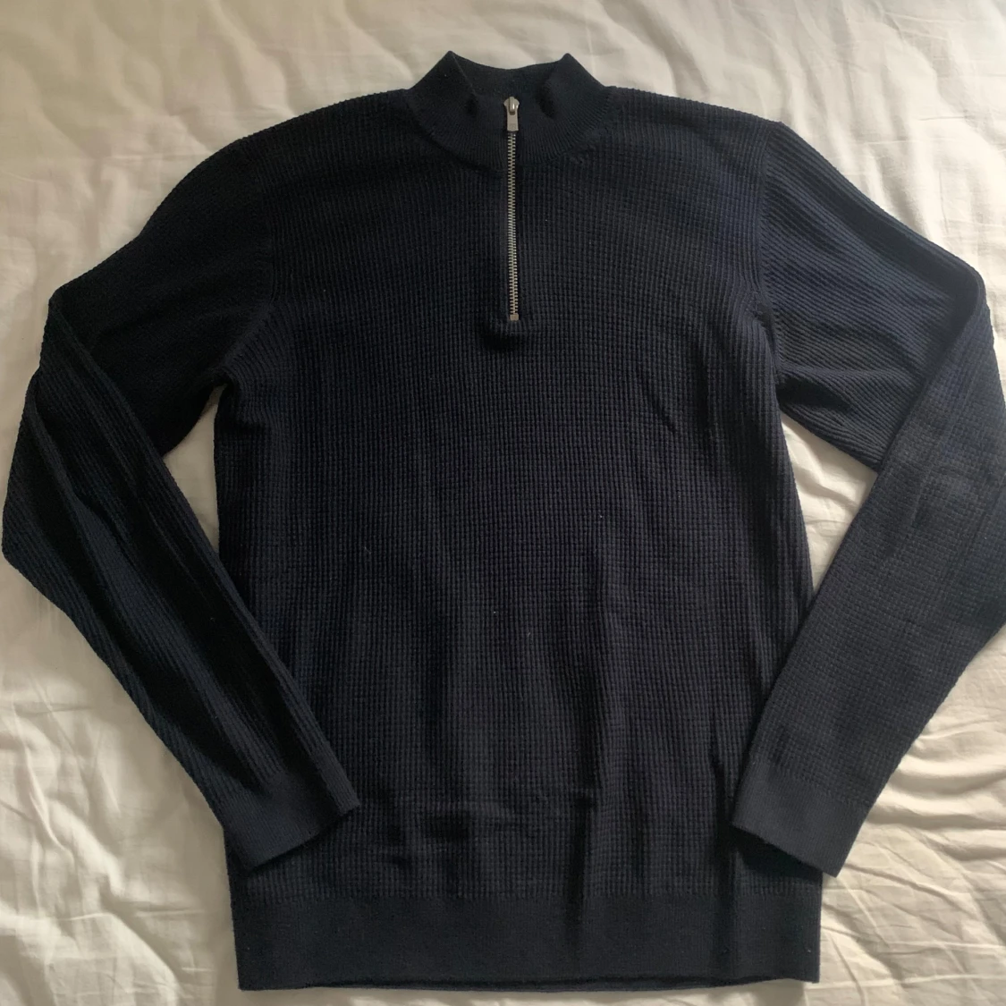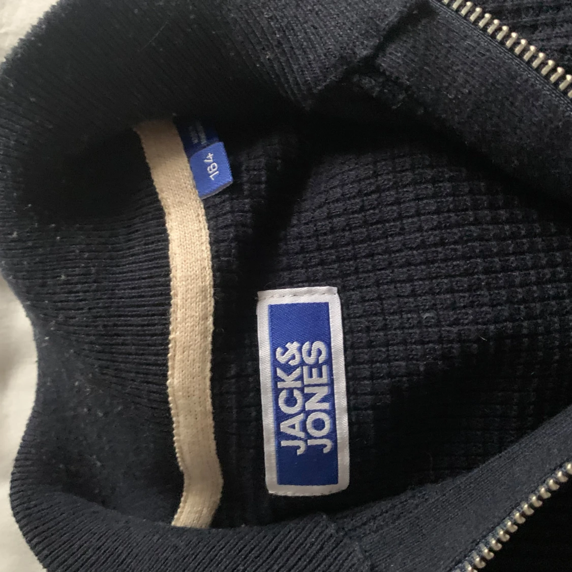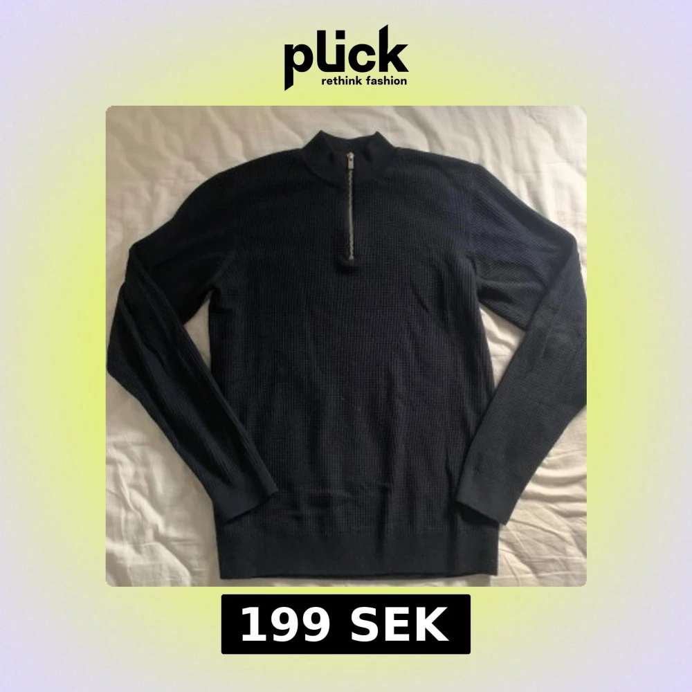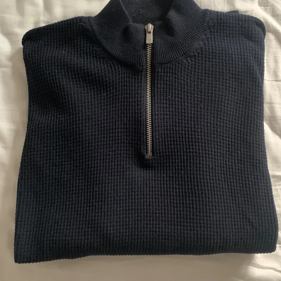 Säljer en stilren mörkblå tröja från Jack & Jones med halv dragkedja. Perfekt för kyligare dagar med sin ribbade struktur och långa ärmar. Enkel att matcha med olika outfits.
