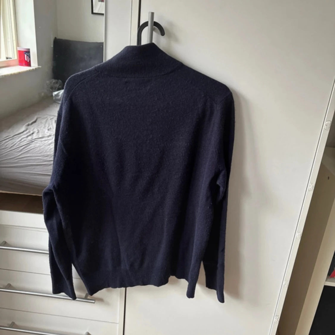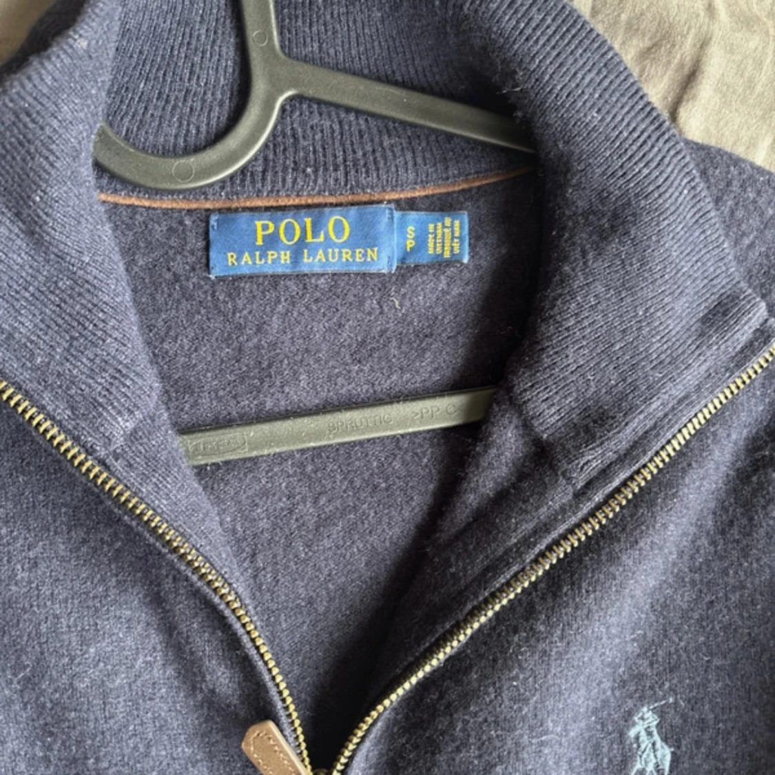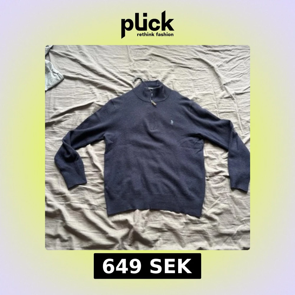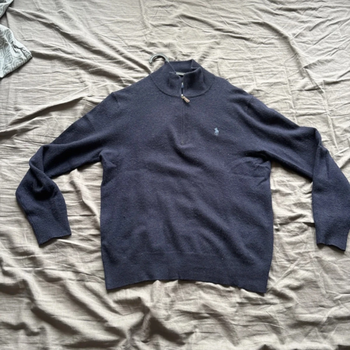 Mörkblå långärmad tröja från Polo Ralph Lauren med half zip och liten broderad logga på bröstet. Tröjan är i ull och har en klassisk, stilren look med ribbade muddar och hög krage. Perfekt för dig som gillar en clean och tidlös stil. Priset är inte fast!!