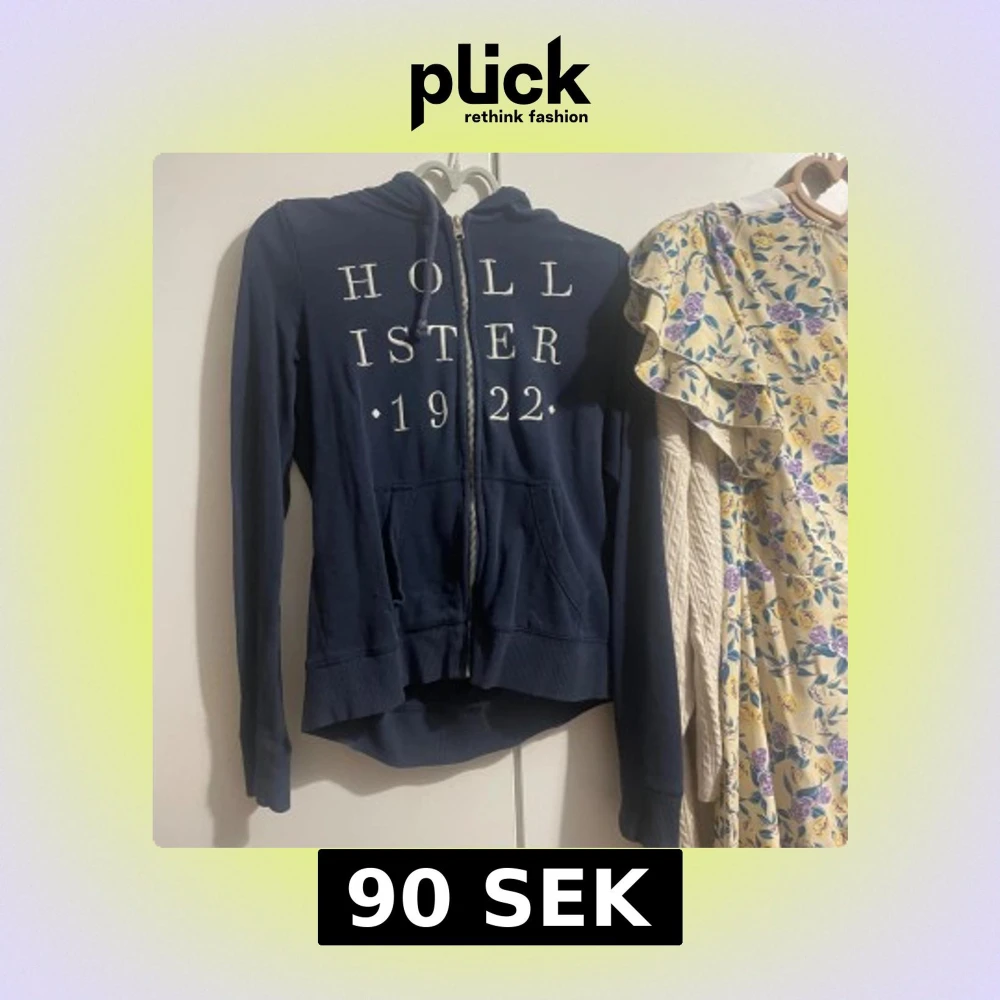 Mörkblå hoodie från Hollister med vit text framtill och dragkedja. Tröjan har huva med blommigt foder, snörning och två fickor framtill. Perfekt för dig som gillar en avslappnad och sportig stil.