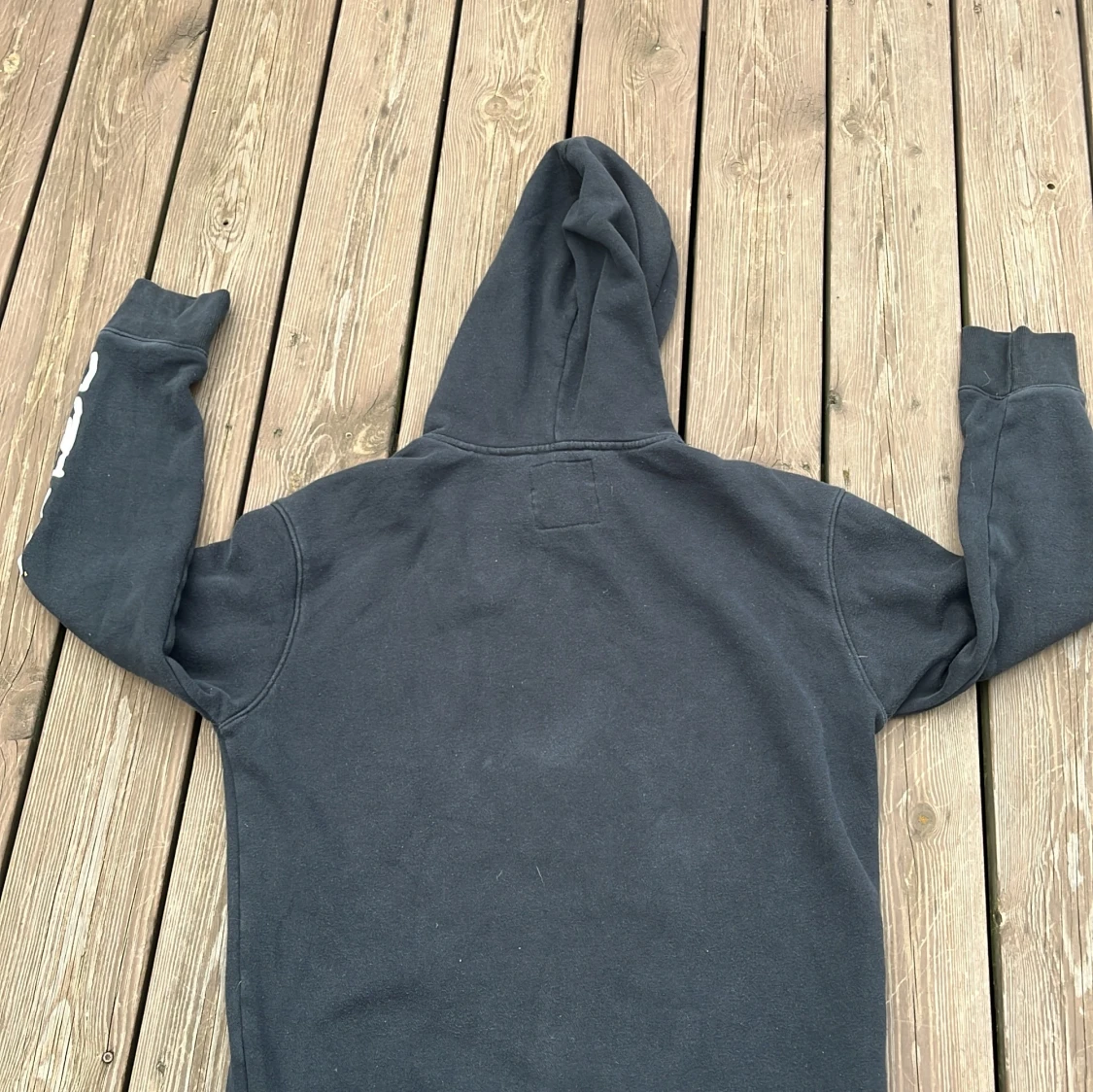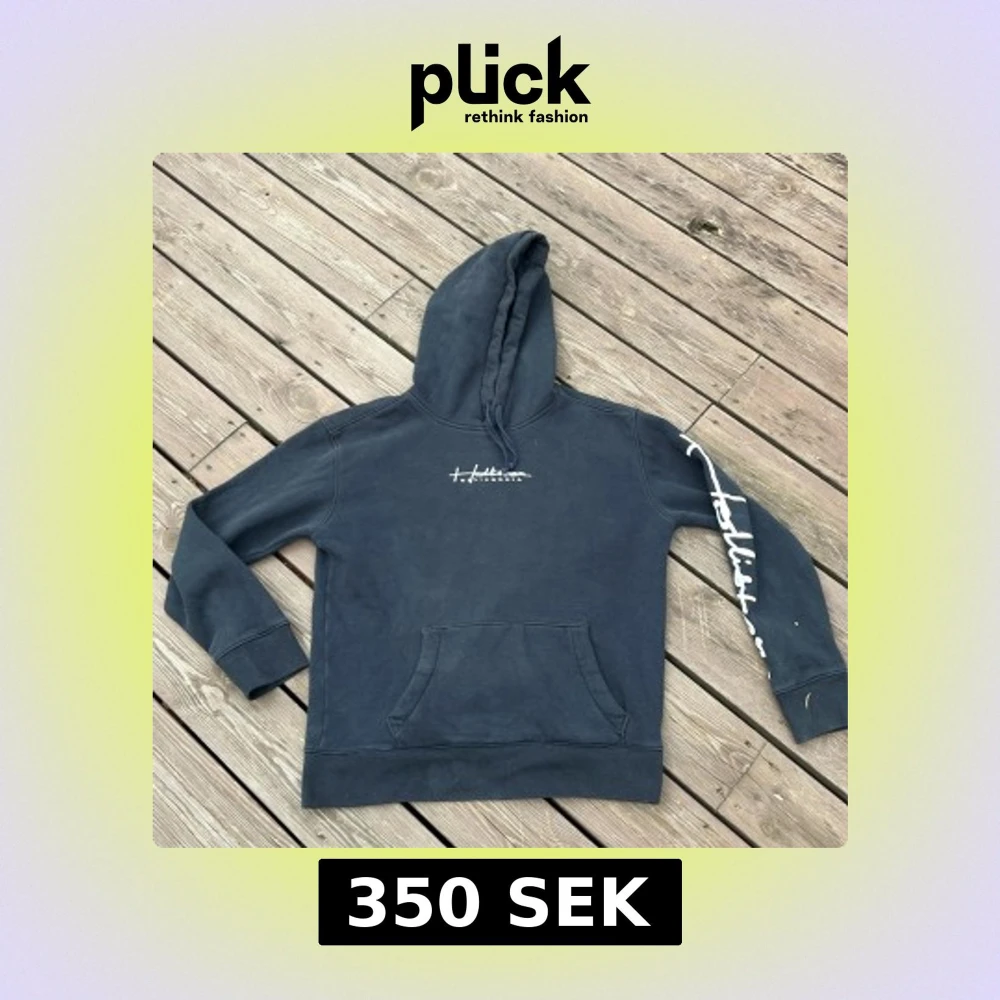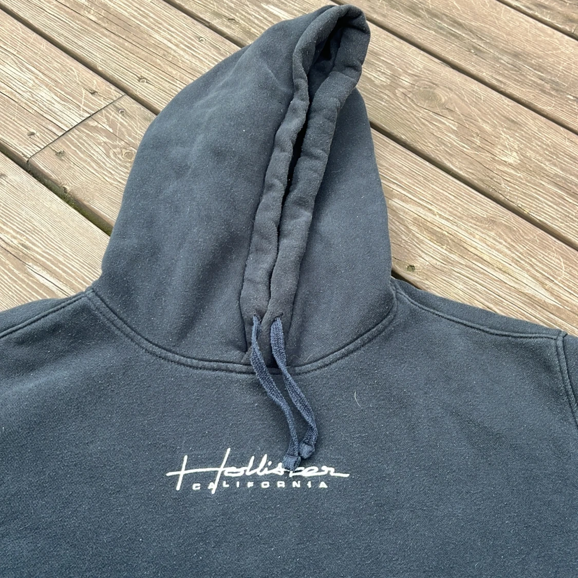 Svart hoodie från Hollister med vit logga på bröstet och stort tryck längs ena ärmen. Tröjan har huva med snörning och en klassisk magficka. Perfekt för chill dagar och enkel att matcha med jeans eller joggers.