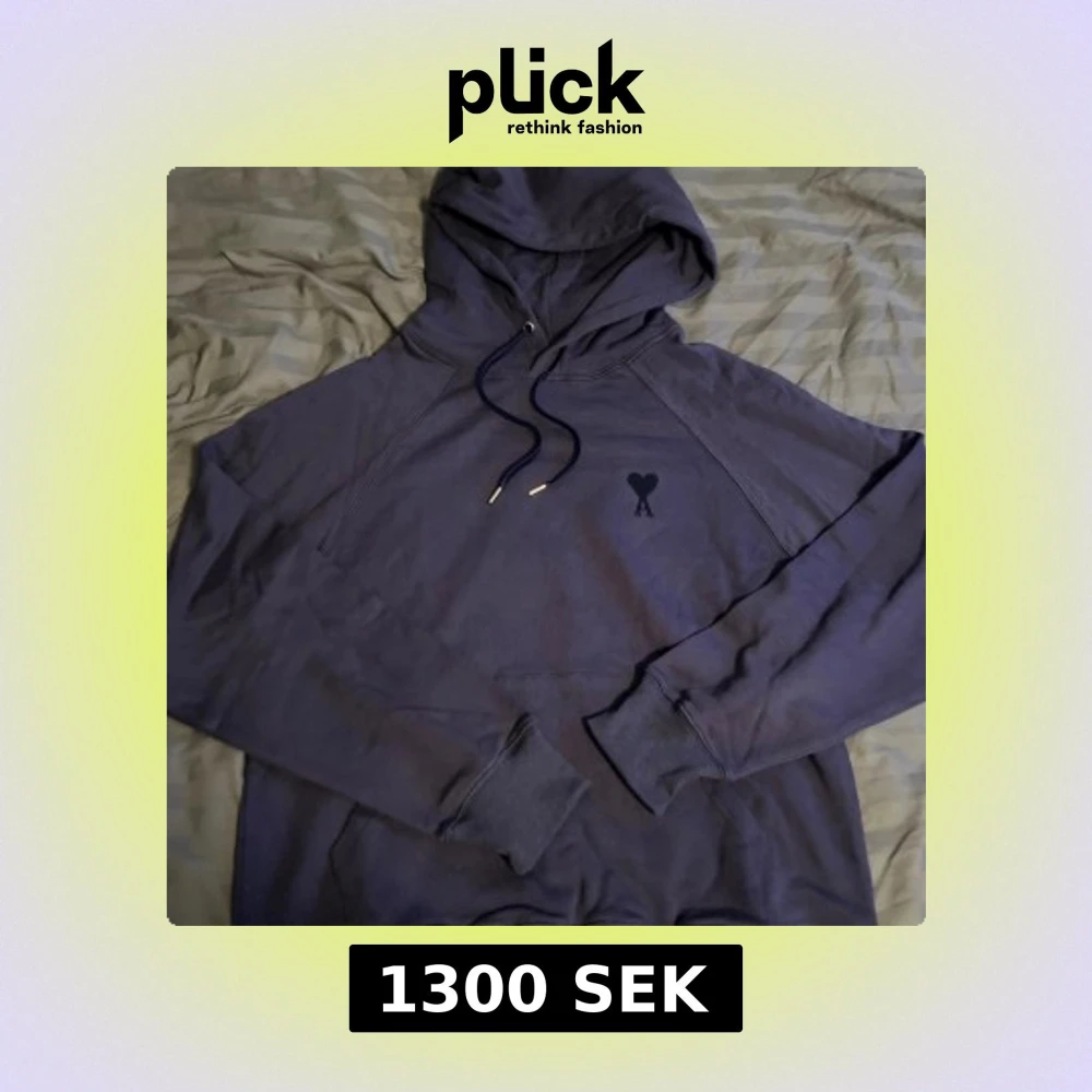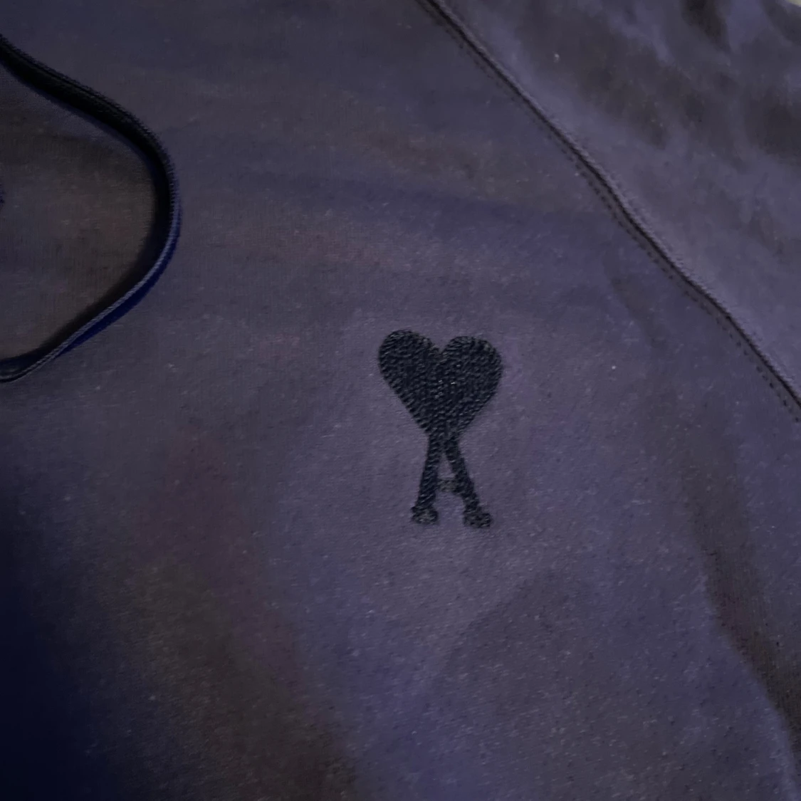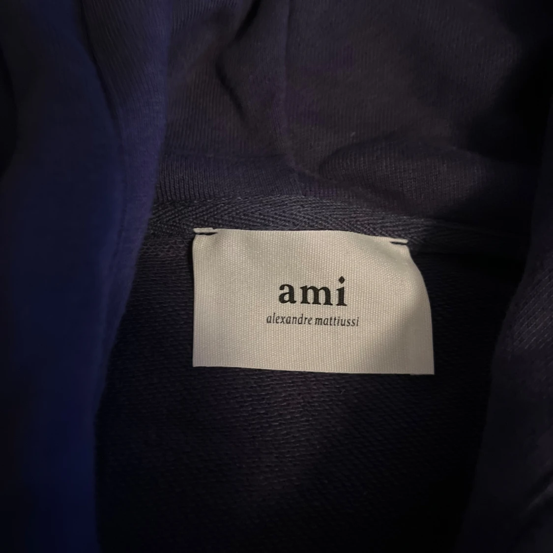 Snygg mörkblå hoodie från Ami Paris med huva och snörning. Tröjan har broderad Ami-logga med hjärta på bröstet och diskret broderad text i nacken. Storleken är L och mitt prs 1300