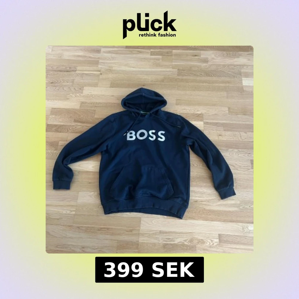 Säljer en mörkblå hoodie från BOSS med stor vit logga på bröstet. Tröjan har huva med dragsko och en stor magficka framtill. Perfekt för en avslappnad och stilren look.