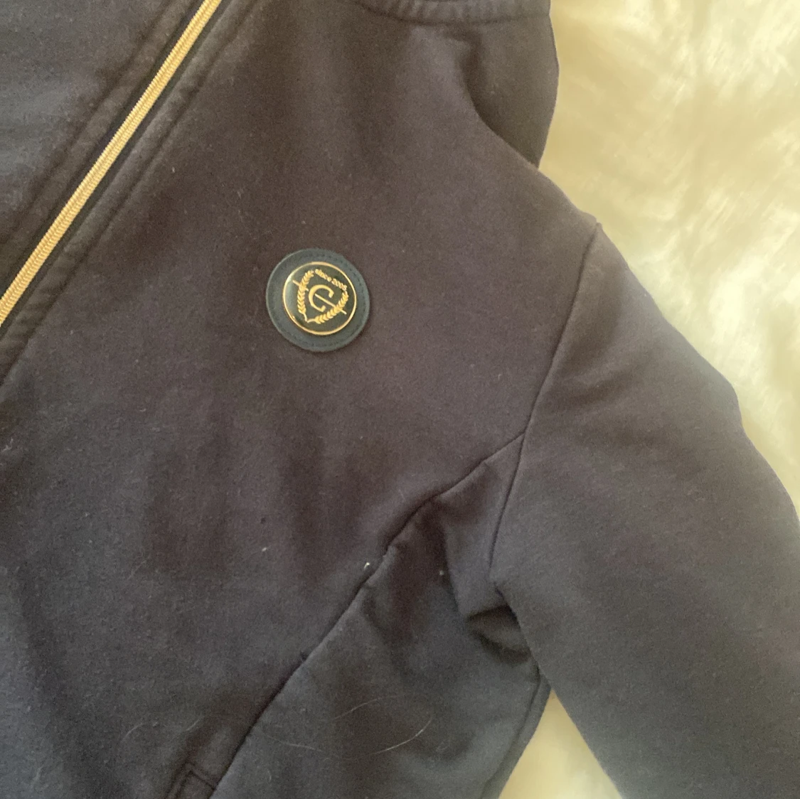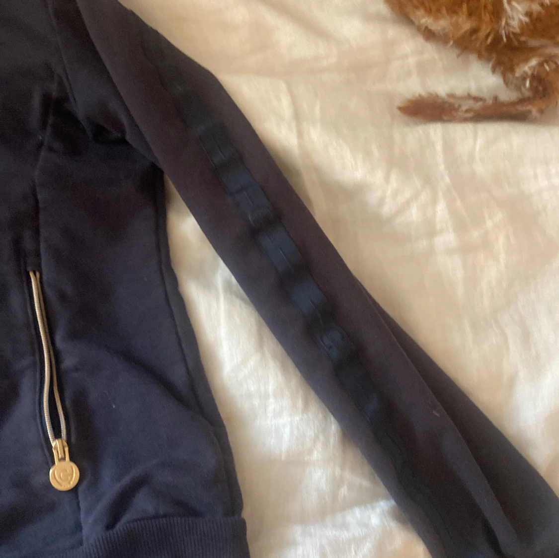 Snygg mörkblå hoodie från Cavalleria Toscana med guldfärgade dragkedjor och logga på bröstet. Tröjan har huva, långa ärmar och diskret mönster längs ärmarna. Perfekt för dig som gillar stilren och sportig look.