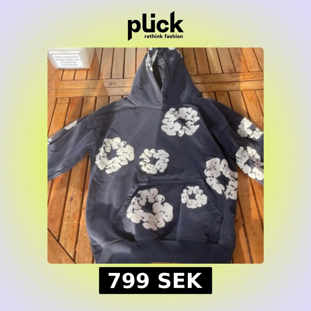 Cool mörkblå hoodie från Denim Tears med unika vita blomliknande tryck över hela tröjan. Klassisk känguruficka framtill och huva. Perfekt för dig som vill sticka ut med streetwear vibes.