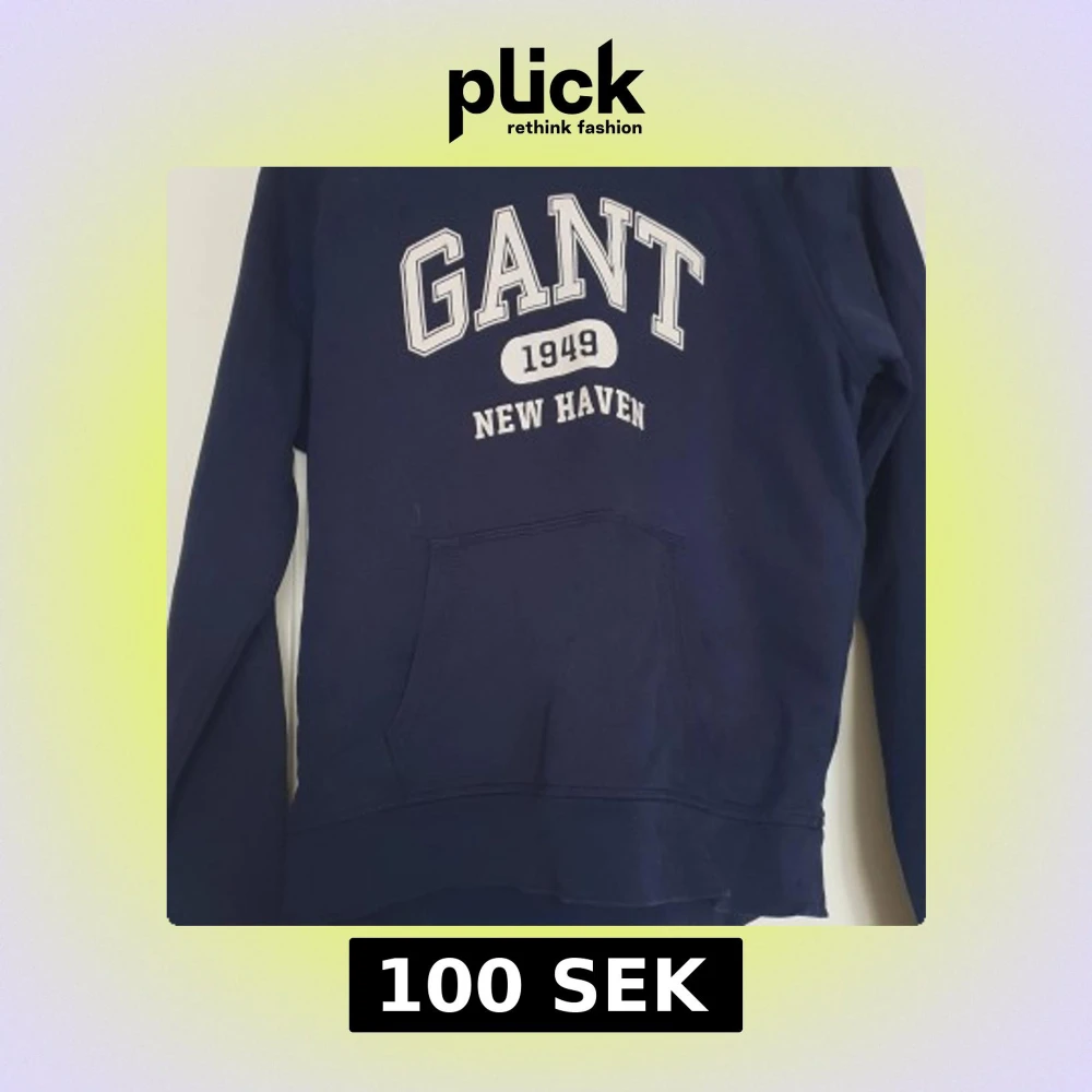 Säljer en mörkblå hoodie från Gant med vit text 'GANT 1949 NEW HAVEN' på bröstet. Tröjan har huva, magficka och långa ärmar. Perfekt för en avslappnad stil.