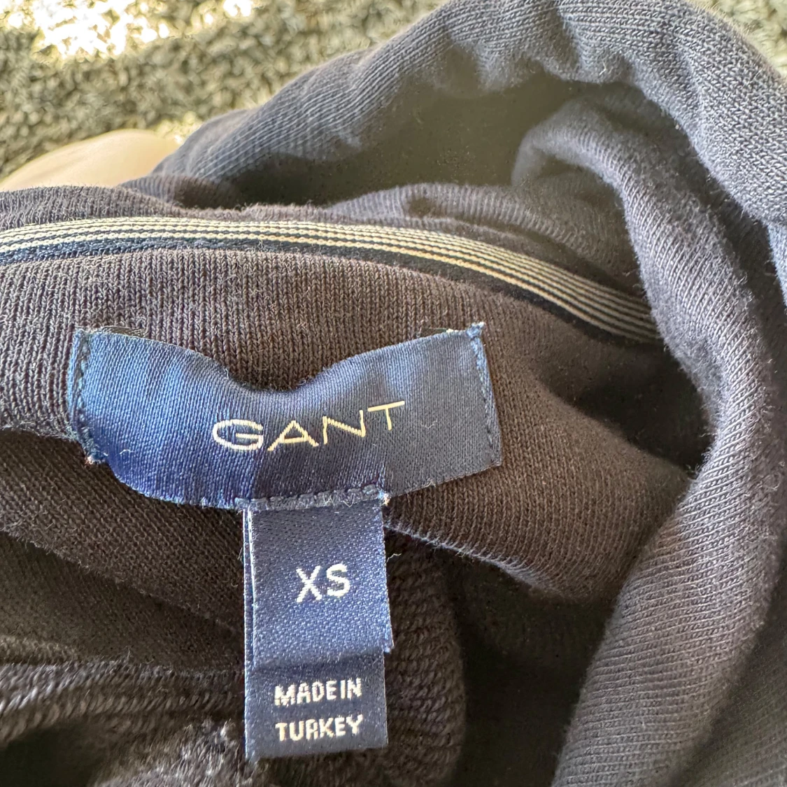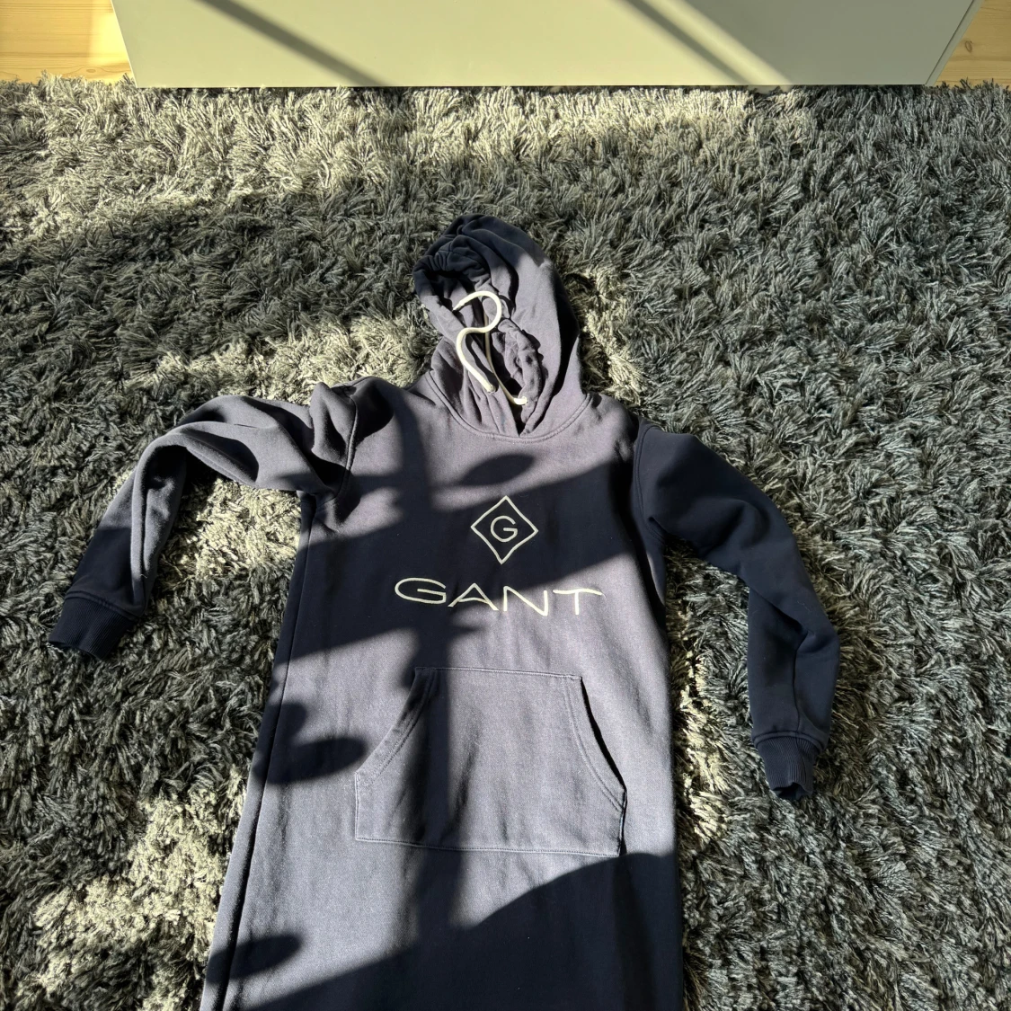 Säljer en snygg mörkblå hoodie från GANT i storlek XS. Tröjan har en klassisk design med en stor ficka framtill och GANT-loggan tryckt på bröstet. Perfekt för en avslappnad stil.