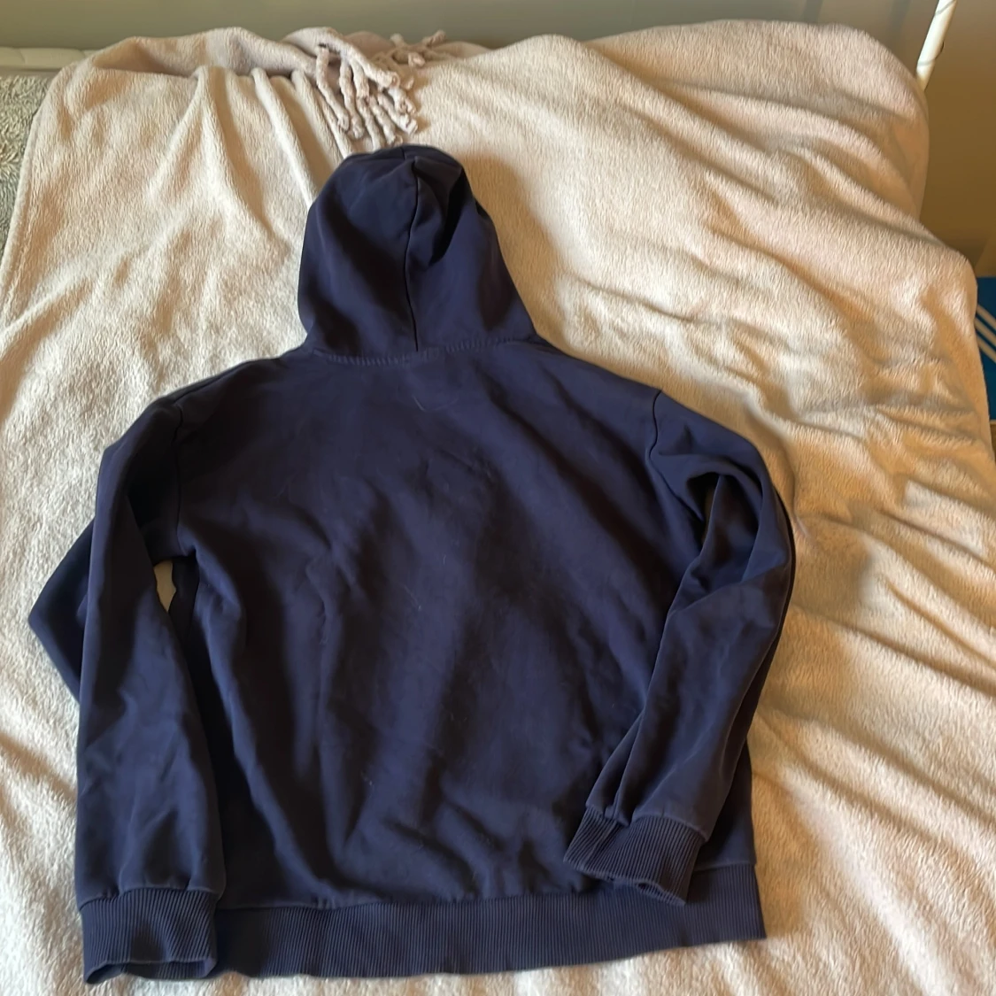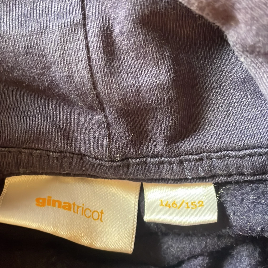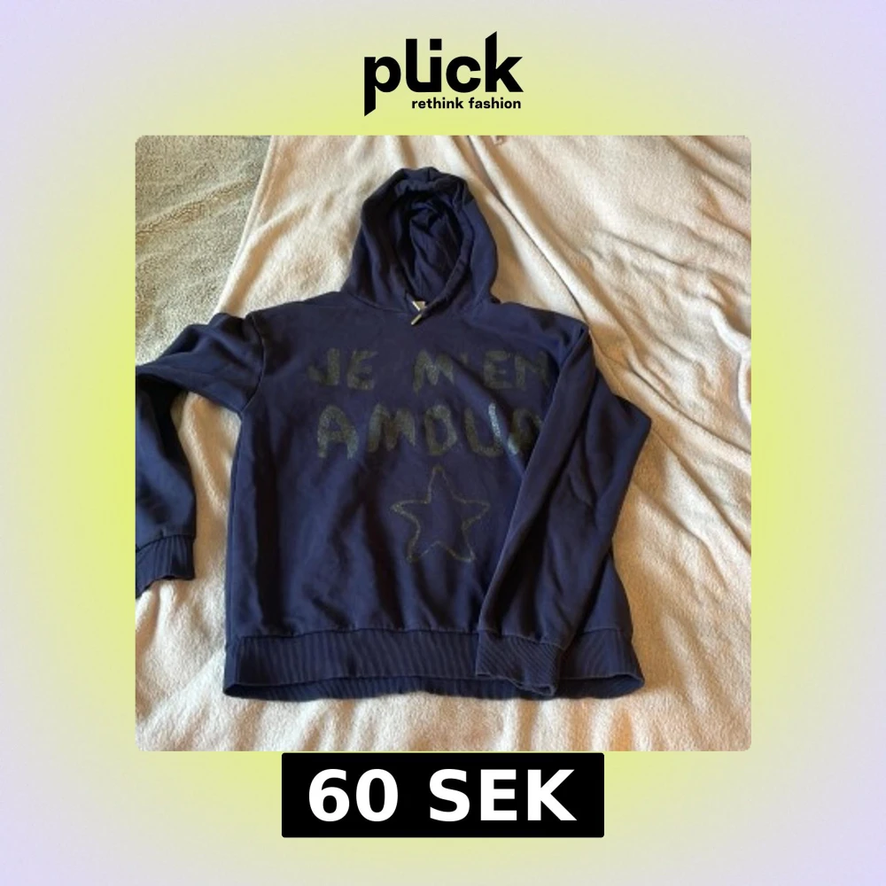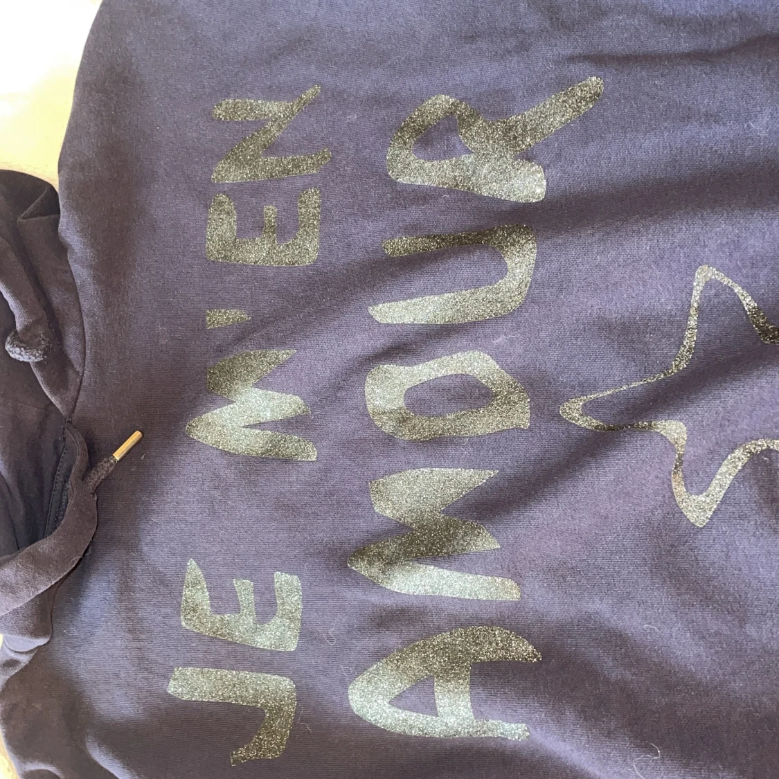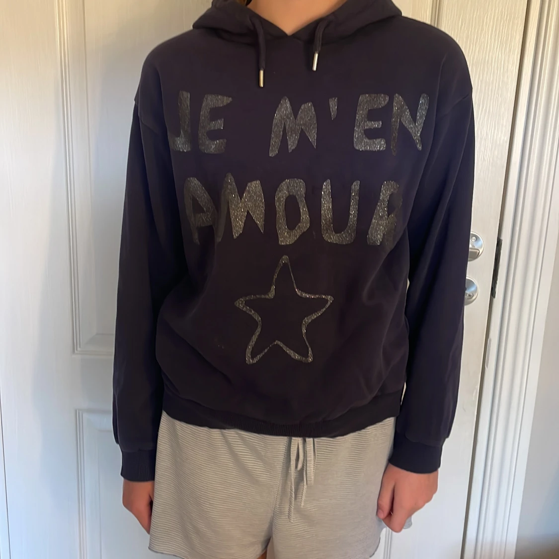 Mörkblå hoodie från Gina Tricot med glittrig text 'JE M'EN AMOUR' och en stjärna framtill. Tröjan har huva, långa ärmar och ribbade muddar. Perfekt för dig som gillar en chill och snygg stil.