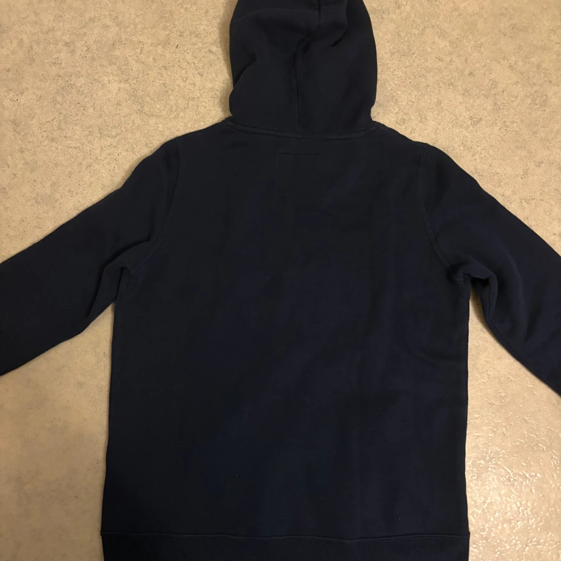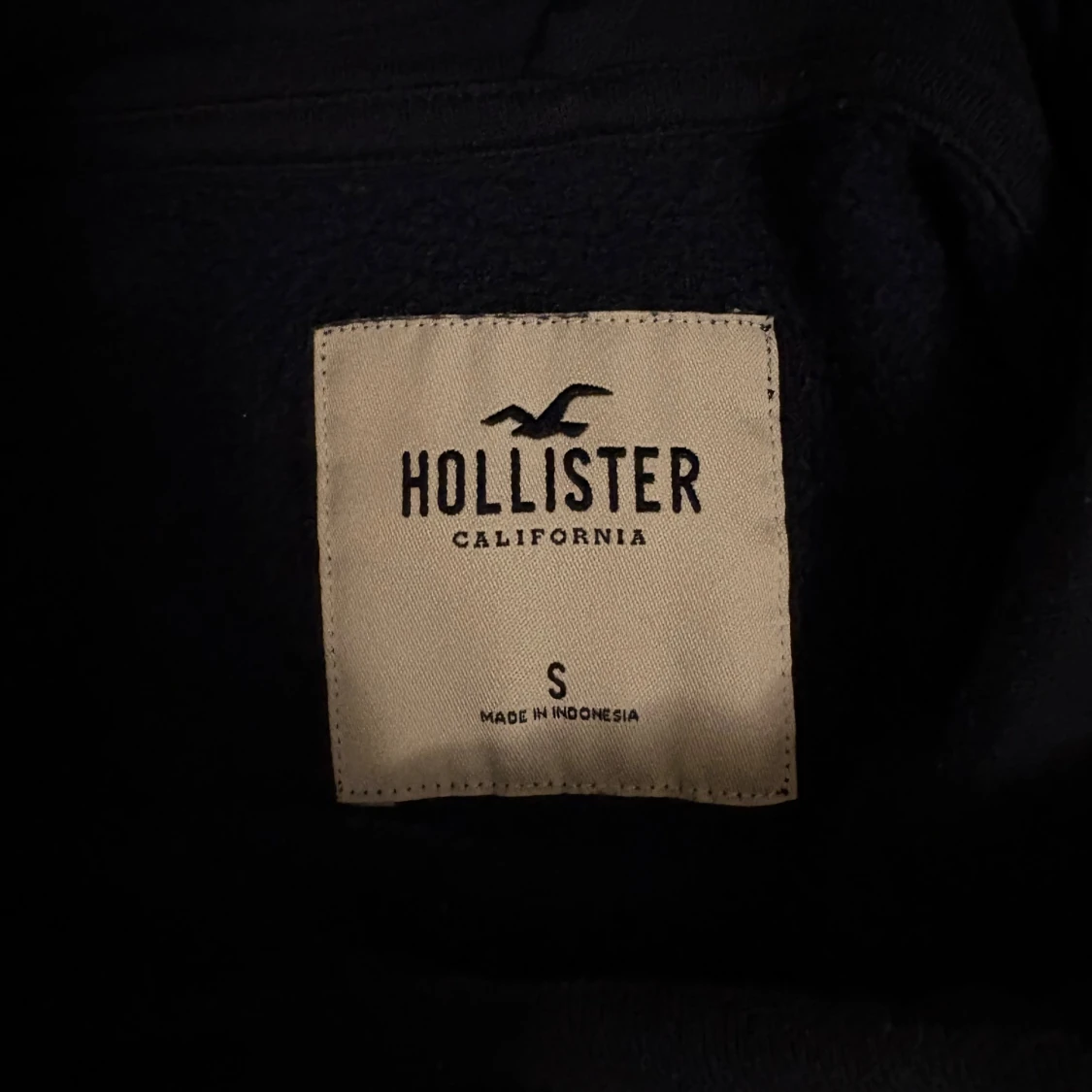 Snygg mörkblå hoodie från Hollister med stor logga och texten 'California' broderad på bröstet. Tröjan har huva med snörning, magficka och långa ärmar. Perfekt för chill dagar och enkel att matcha med jeans eller joggers. Bra kvalitet