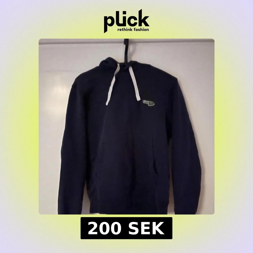 Säljer en mörkblå hoodie från Lacoste med klassisk krokodillogga på bröstet. Tröjan har vit snörning i huvan, känguruficka och långa ärmar. Perfekt för dig som gillar en enkel och stilren look.
