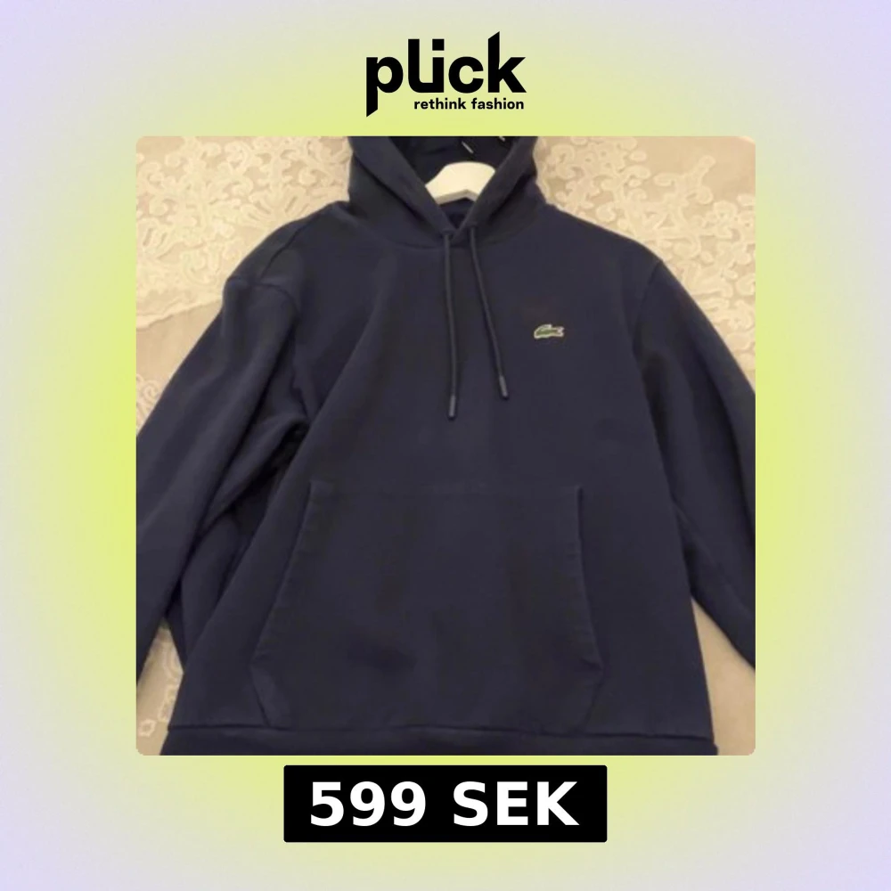 Säljer en stilren mörkblå hoodie från Lacoste med klassisk passform. Tröjan har en känguruficka och justerbar huva med dragsko. Perfekt för en avslappnad look. (Köpt för 999)