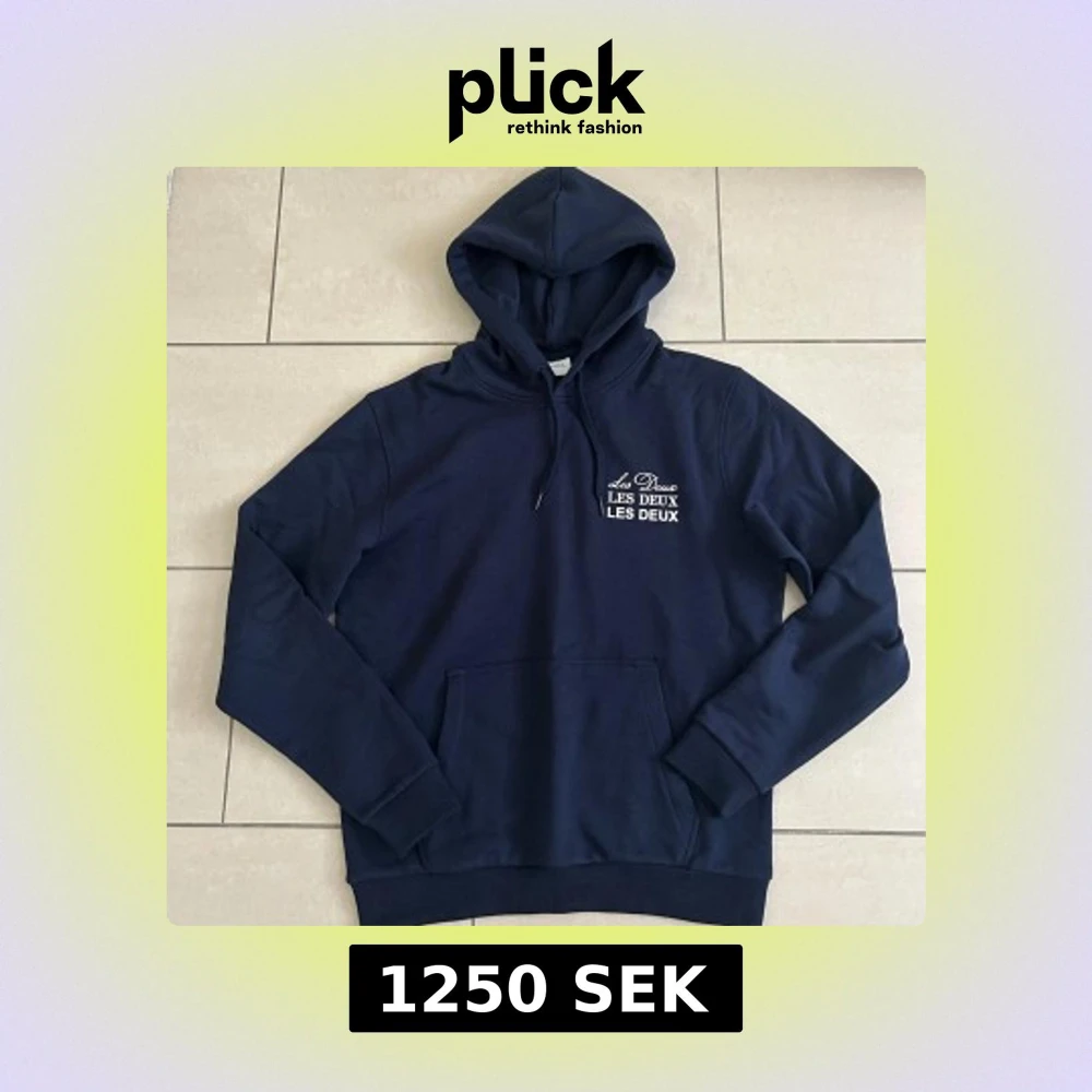 Snygg mörkblå hoodie från Les Deux med vit logga tryckt på bröstet. Klassisk känguruficka, huva med snörning och ribbade muddar. Perfekt för chill dagar och enkel att matcha med jeans. Originalpris runt 1600kr och pris kan diskuteras!