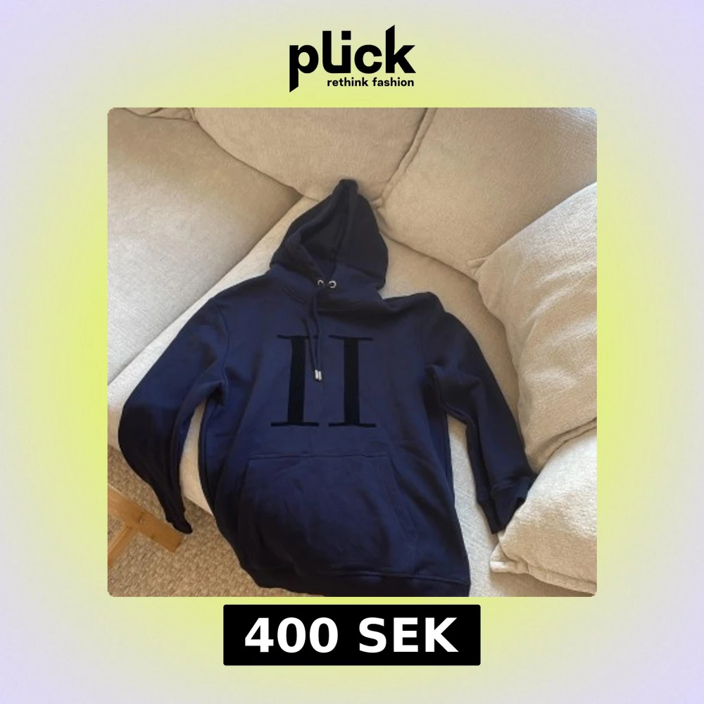 Snygg mörkblå hoodie från Les Deux med stor svart II-logga på bröstet. Tröjan har huva med snörning, känguruficka och ribbade muddar. Perfekt för dig som gillar stilrena och bekväma plagg med en clean look.