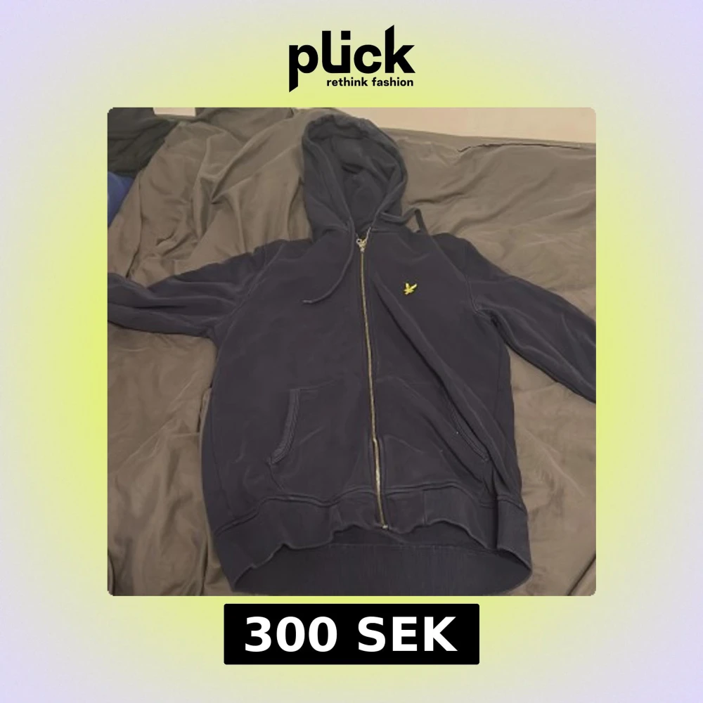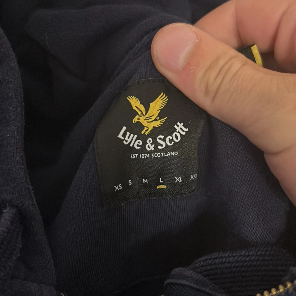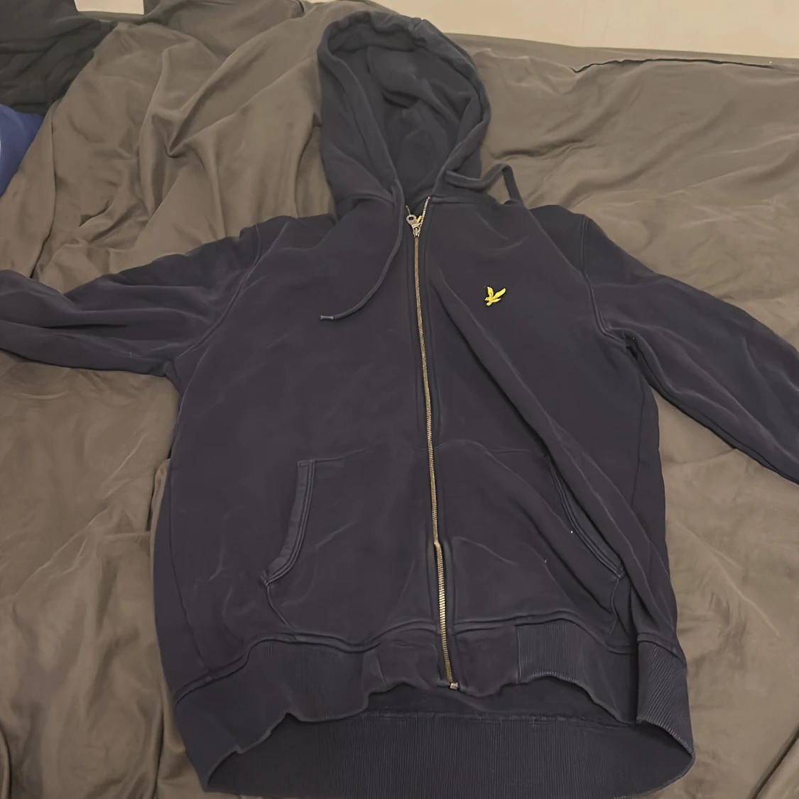 Säljer en mörkblå hoodie från Lyle & Scott med gul logga på bröstet. Tröjan har dragkedja, huva med snörning och två fickor framtill. Ribbad nederkant och ärmslut ger en schysst passform. storlek L men skulle säga liten i storlek