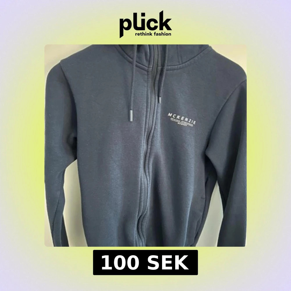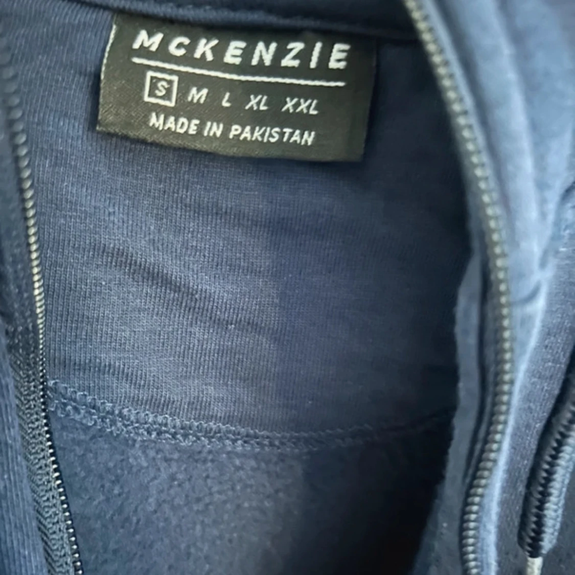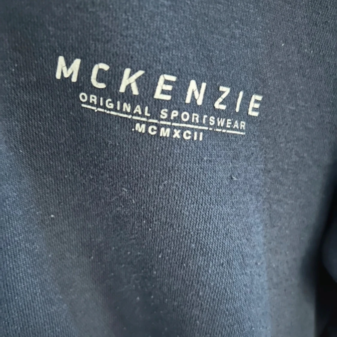 Mörkblå hoodie från McKenzie med dragkedja och huva. Tröjan har snörning i huvan och vit logga på bröstet. Tillverkad i mjuk bomullsmix, perfekt för chill dagar eller när du vill ha en enkel streetstyle-look.