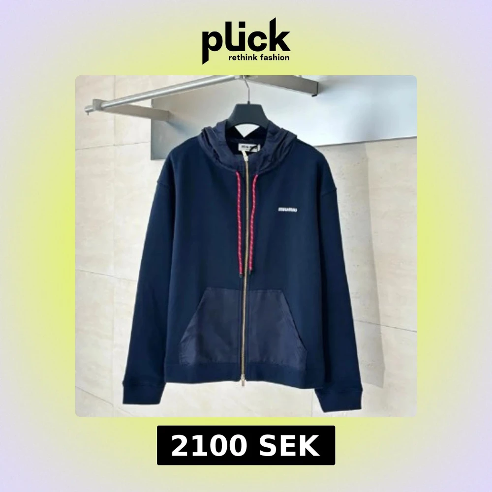 Snygg mörkblå hoodie från Miu Miu med dragkedja och huva i glansigt material. Röd snörning med vita detaljer och guldfärgad detalj på snöret. Fickor framtill och diskret logga på bröstet. Perfekt för dig som gillar streetstyle och exklusiva märken.