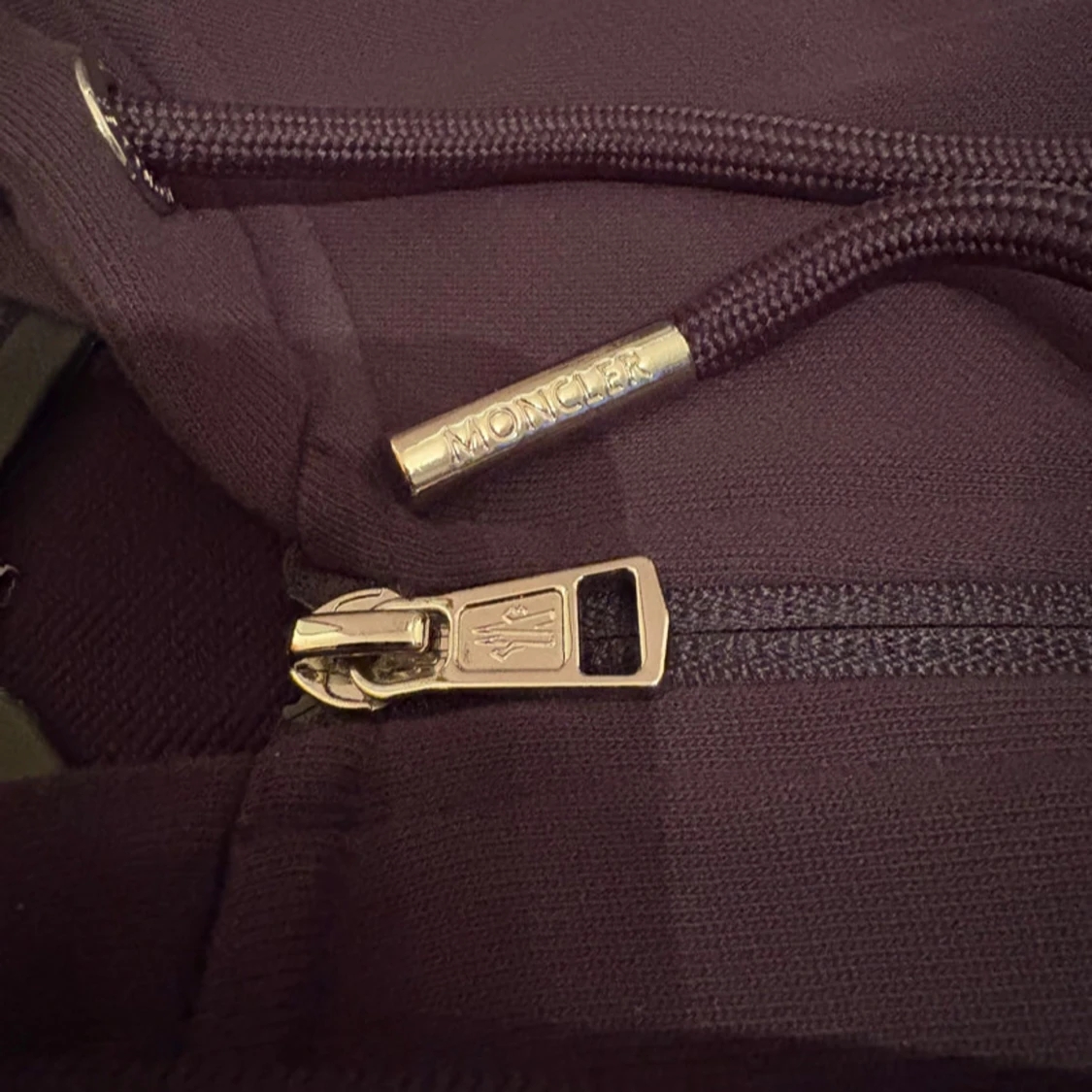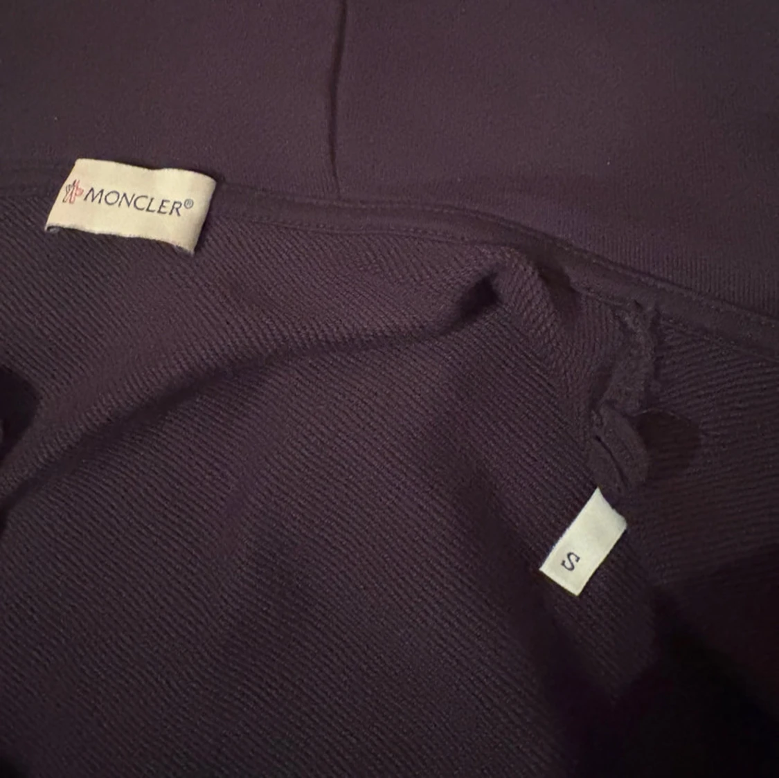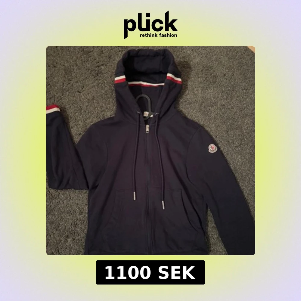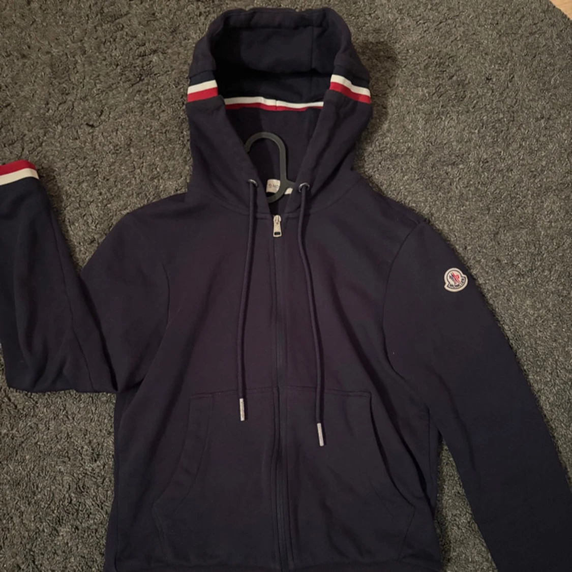 Pris kan diskuteras kom PM‼️ Snygg mörkblå hoodie från Moncler med dragkedja och huva. Den har röda och vita ränder på huvan och ärmsluten. Perfekt för en stilren och bekväm look. Storlek S men passar även XS‼️