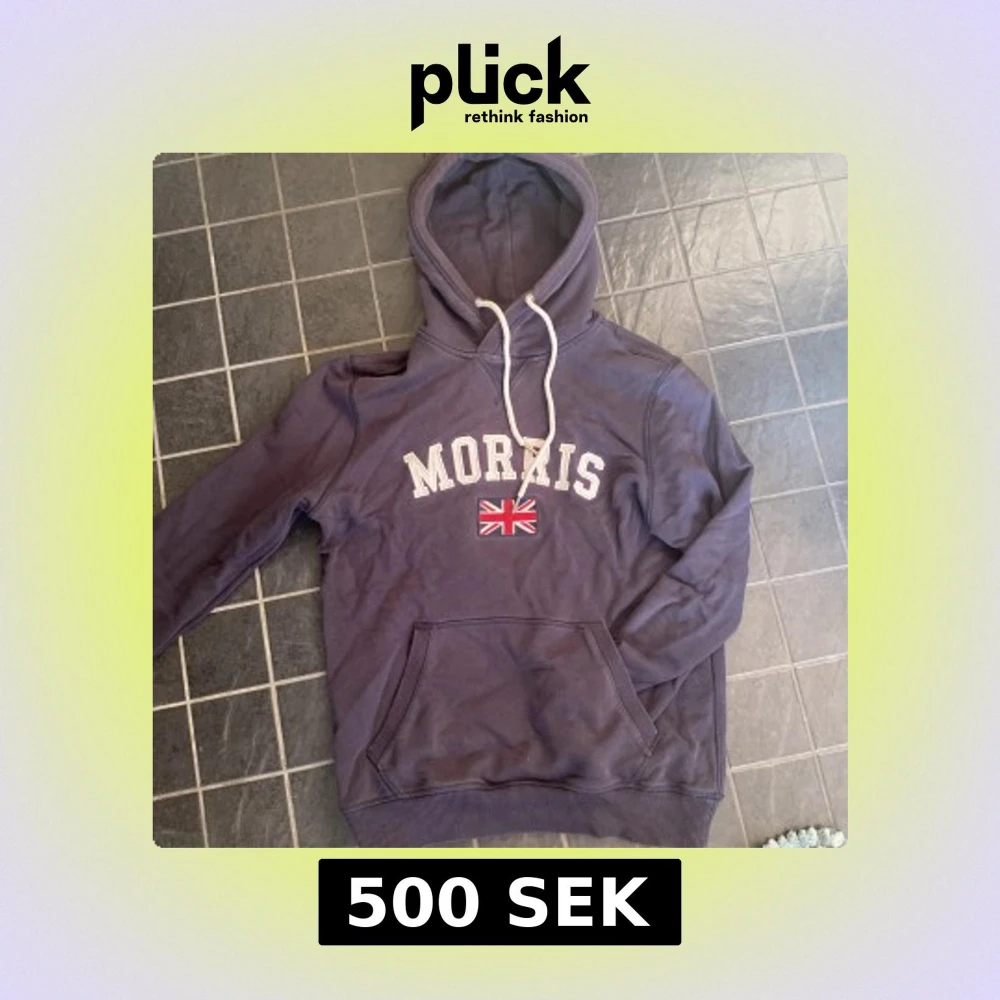 Säljer en snygg mörkblå hoodie från Morris med vit text och en Union Jack-flagga på bröstet.