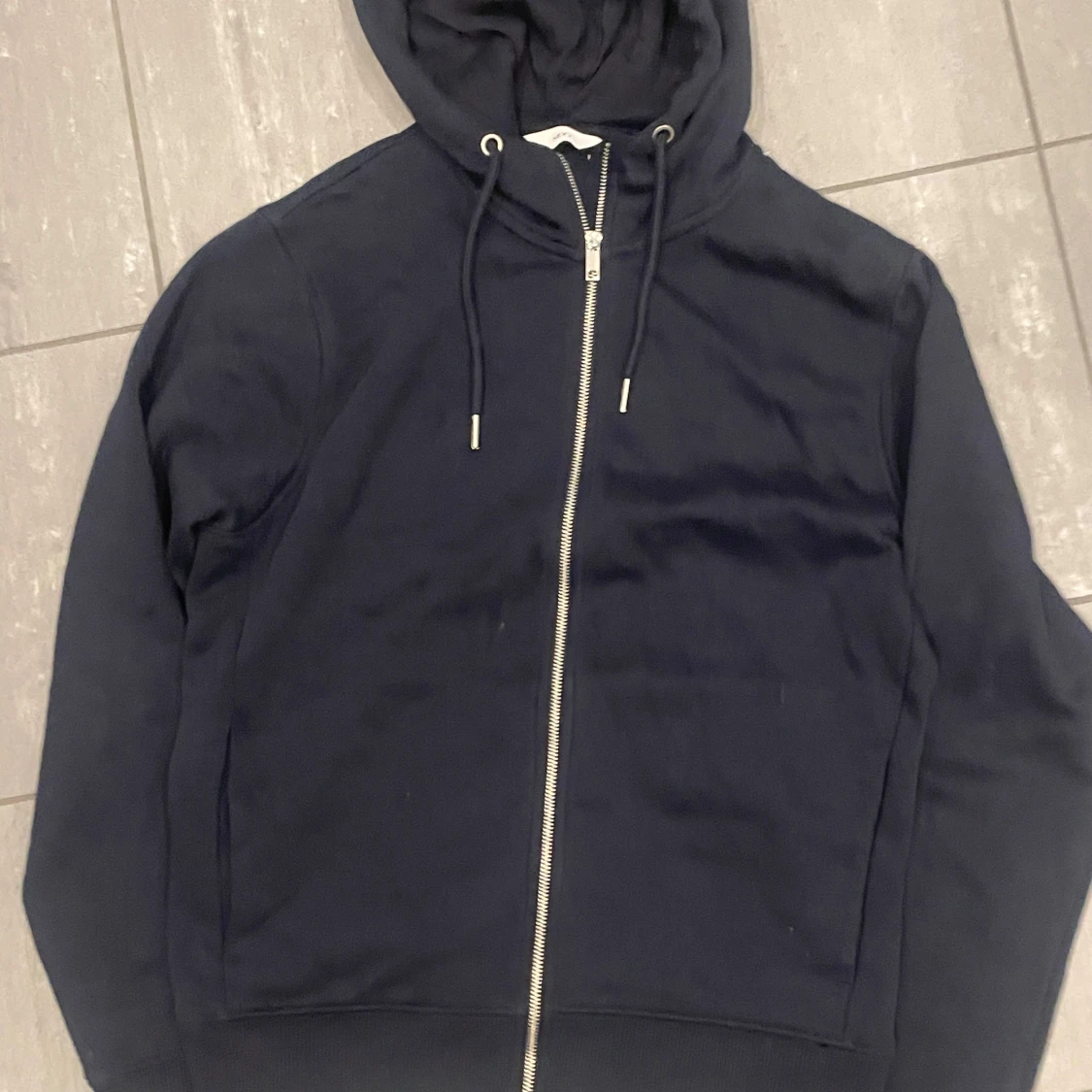 Säljer en mörkblå hoodie från Next med dragkedja och justerbar huva. Perfekt för en avslappnad stil. Tillverkad i mjukt material för extra komfort.