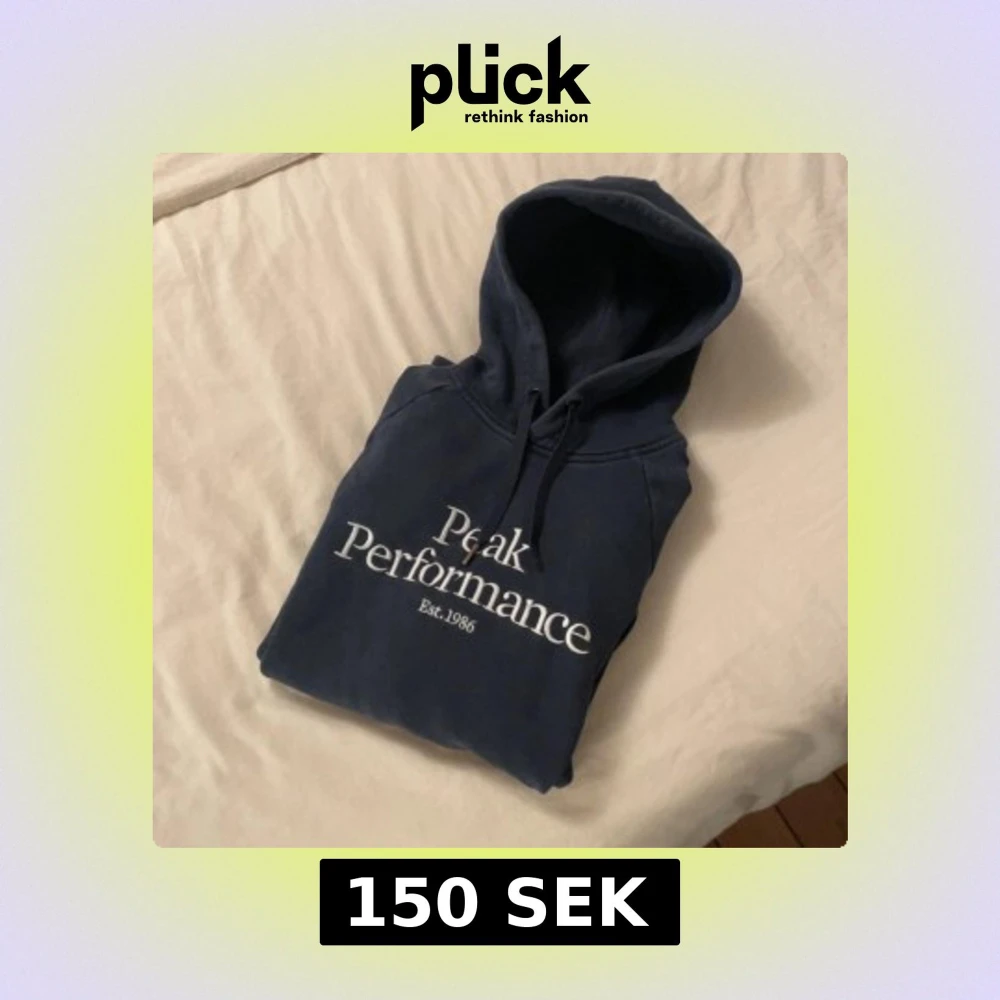 Säljer en mörkblå hoodie från Peak Performance med vit logga och text på bröstet. Klassisk huva med dragsko och mjukt material. Perfekt för en avslappnad stil.
