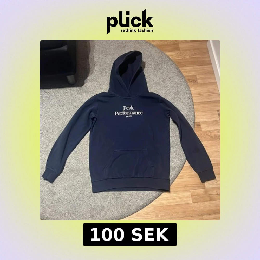 Säljer en mörkblå hoodie från Peak Performance med vit logga på bröstet. Tröjan har huva och en stor magficka framtill. Perfekt för dig som gillar en klassisk och stilren look.