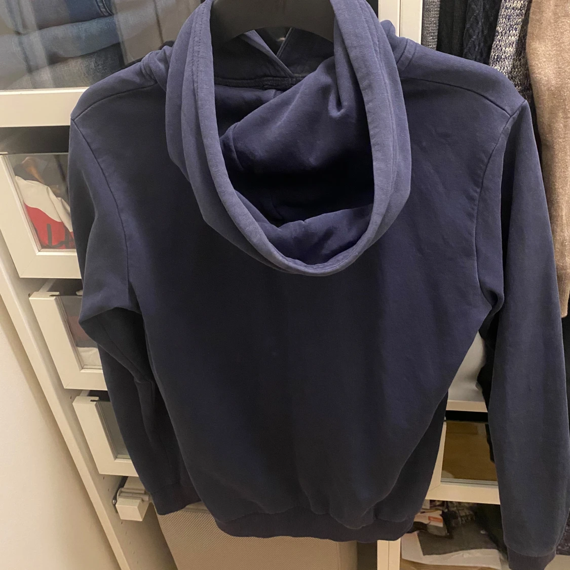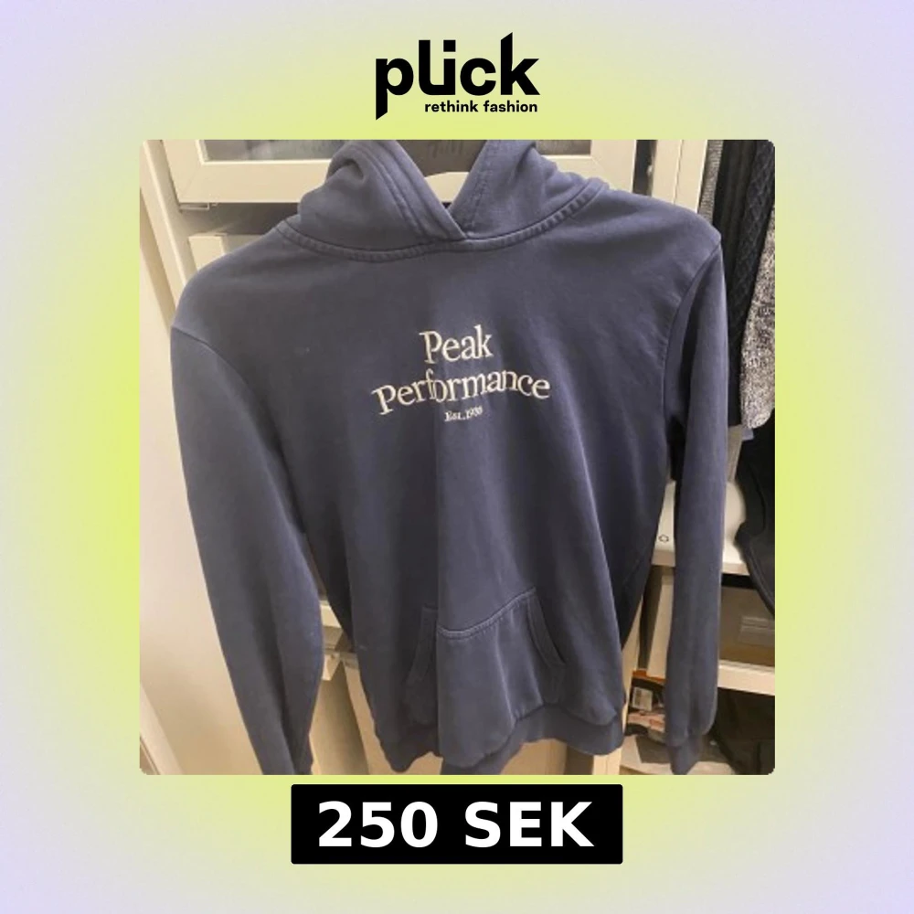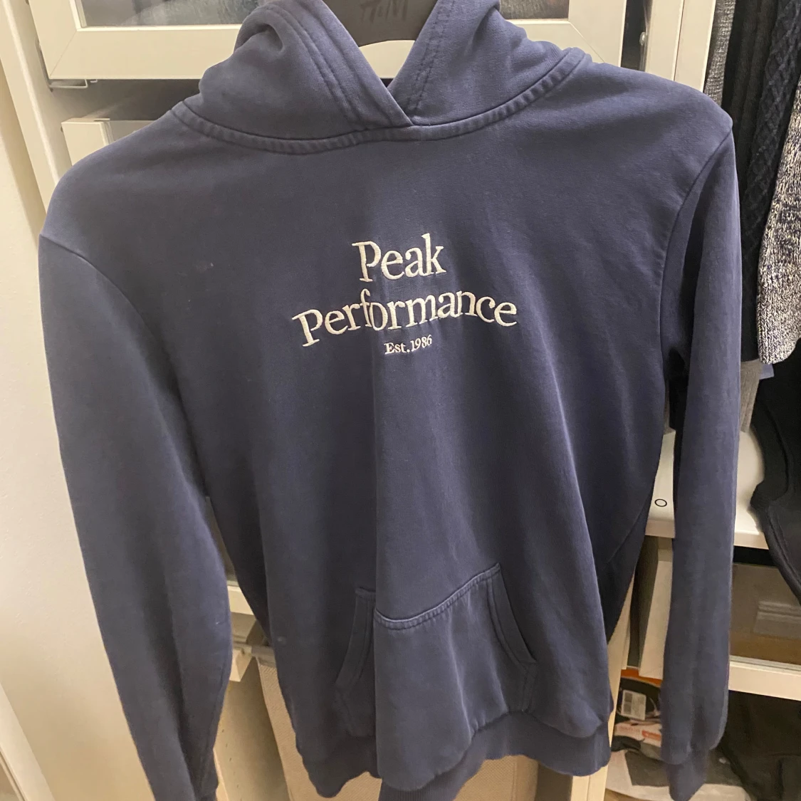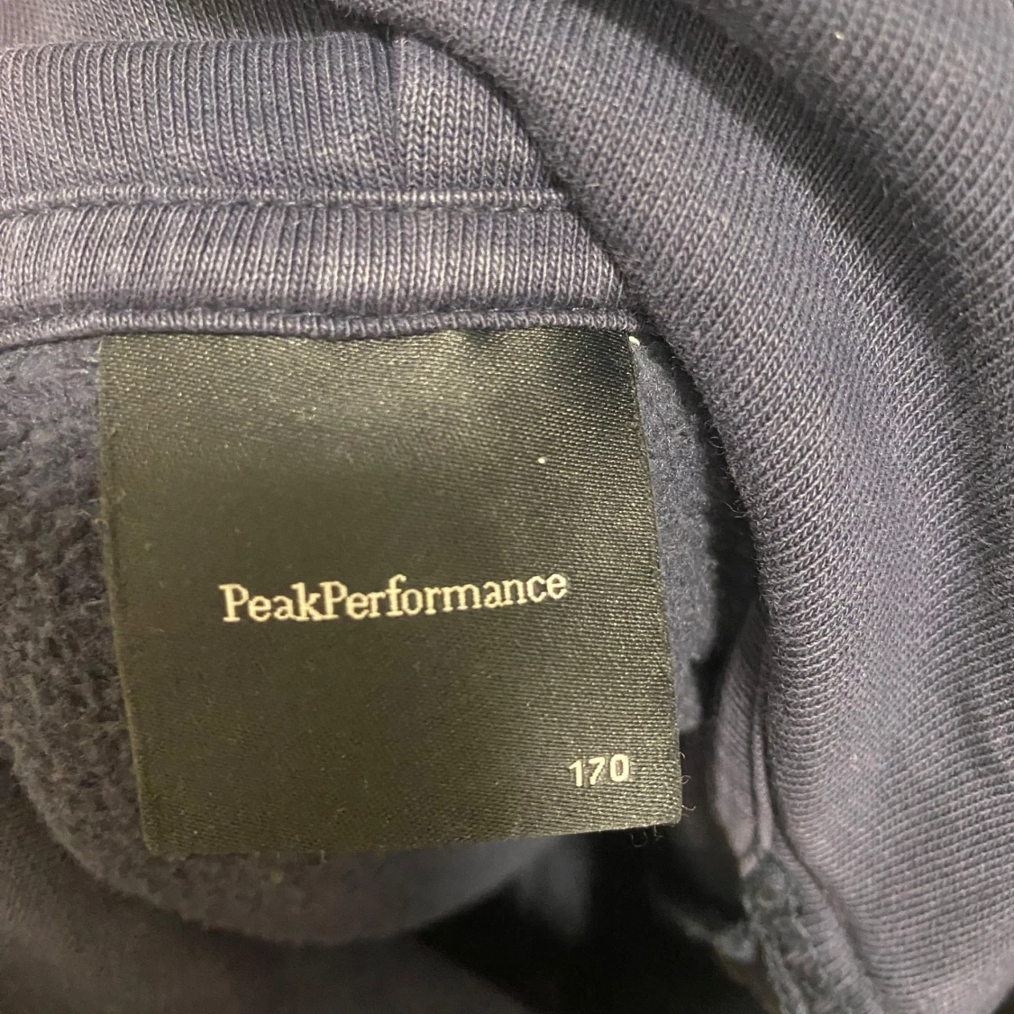 Säljer en snygg mörkblå hoodie från Peak Performance med vit text på bröstet. Tröjan har en klassisk känguruficka och en bekväm huva. Perfekt för en avslappnad stil. Hoodien är i bra skick och är i storlek 170