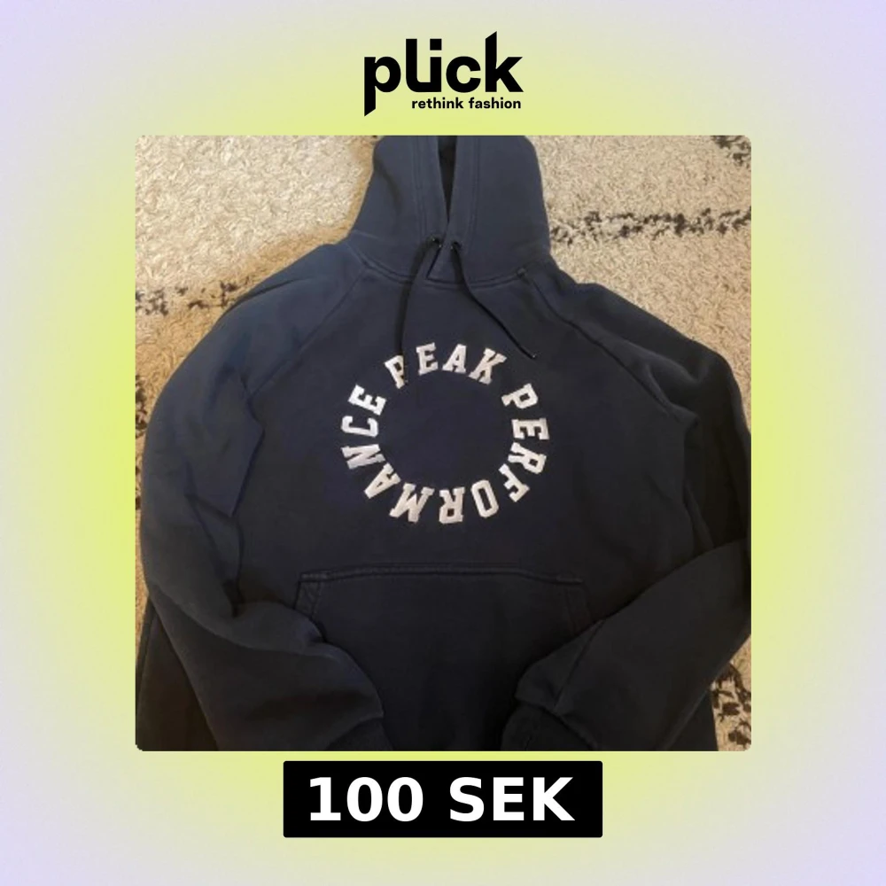Säljer en snygg mörkblå hoodie från Peak Performance med vit text på framsidan. Den har en klassisk design med huva och dragsko samt långa ärmar. Perfekt för en avslappnad stil.