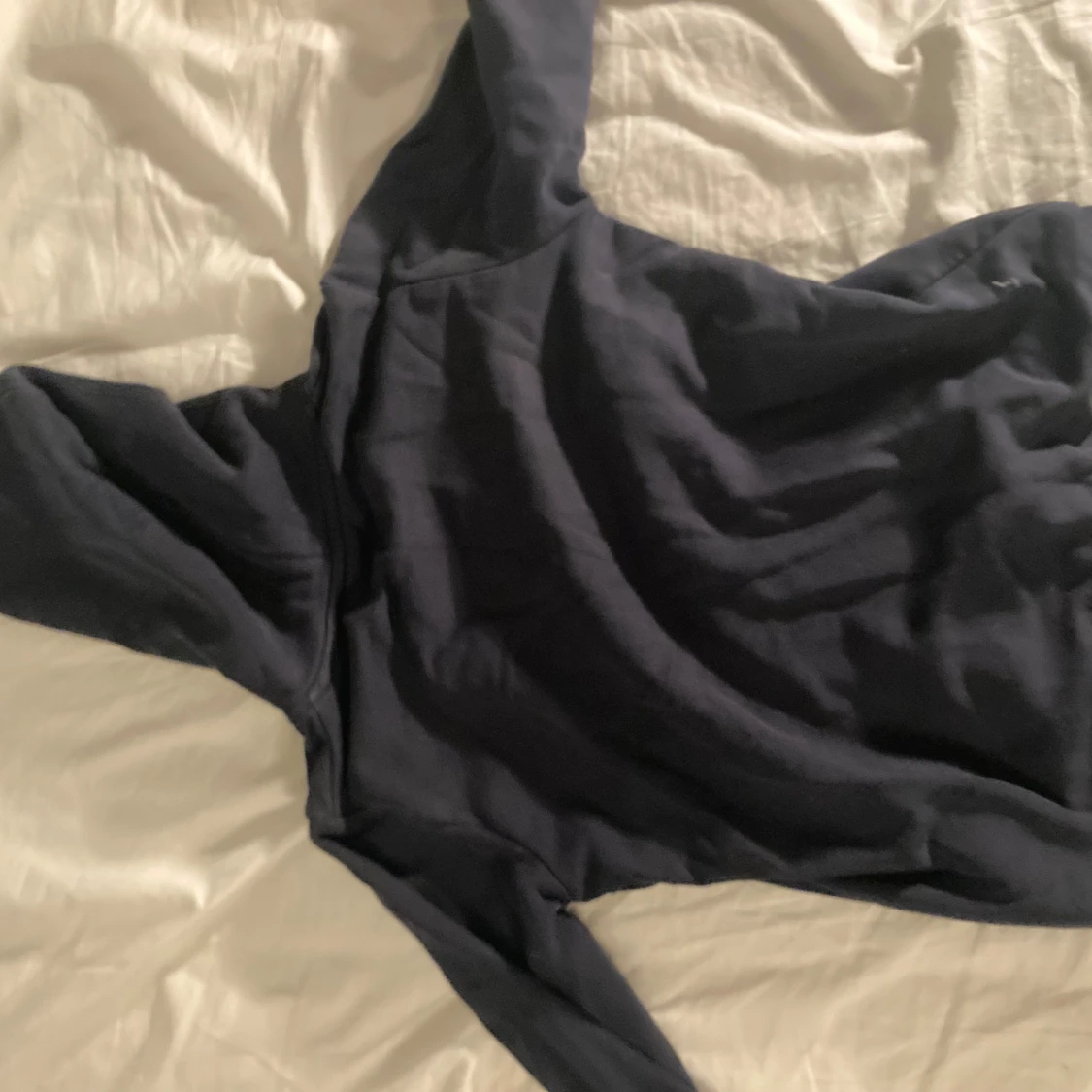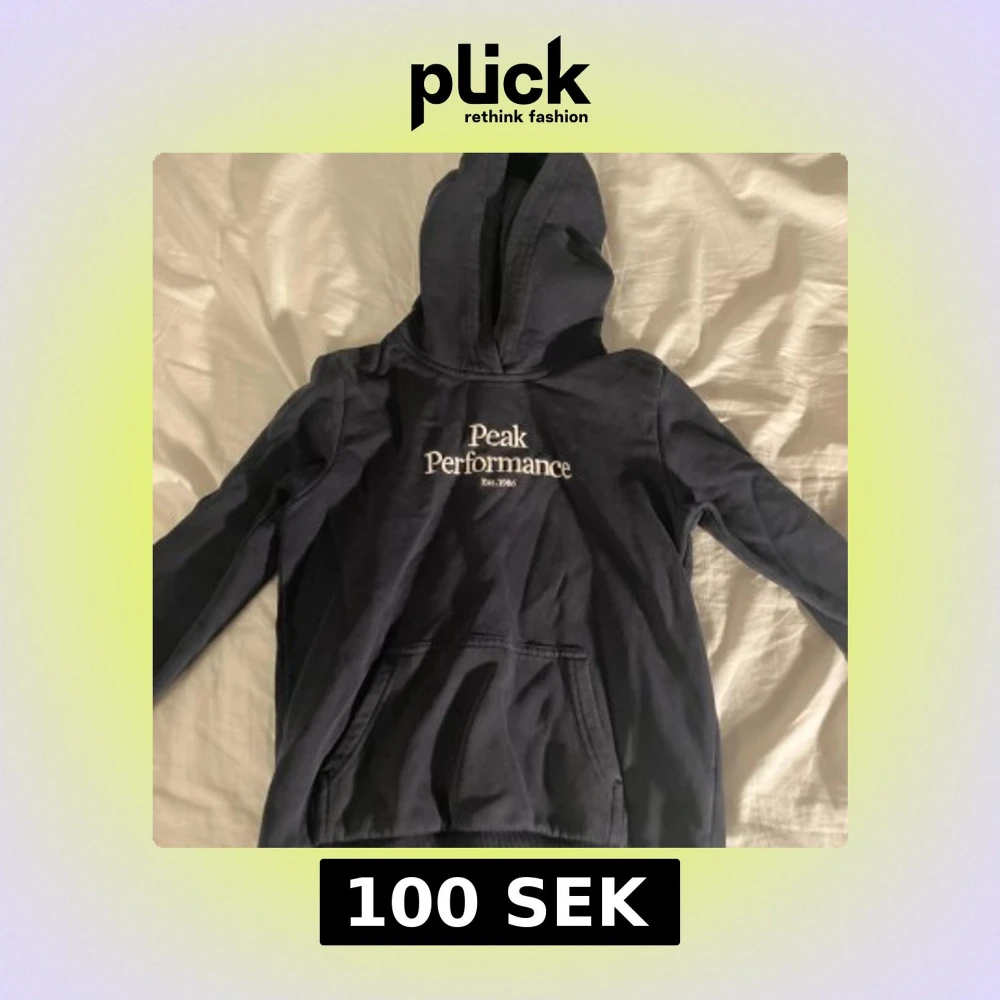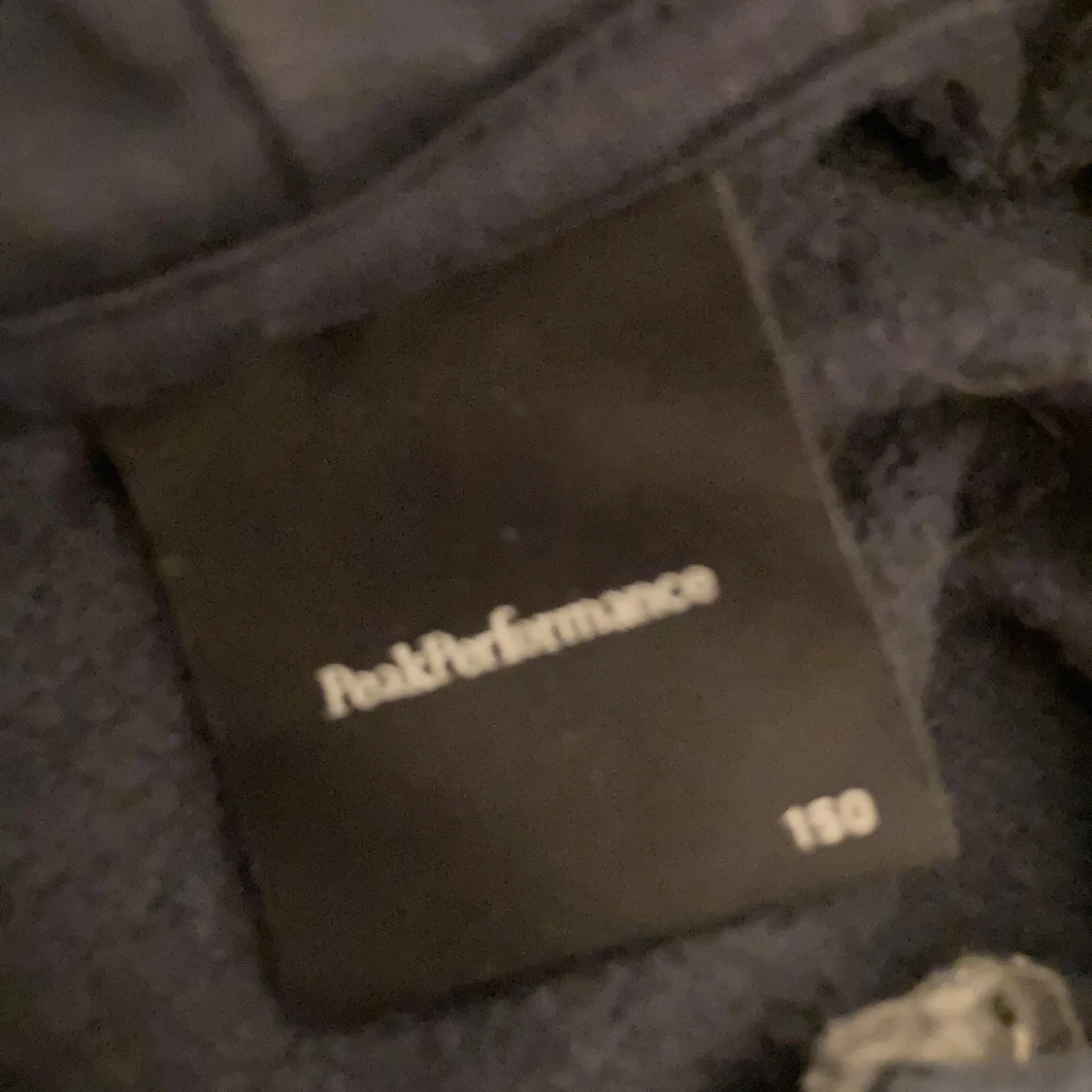 Säljer en mörkblå hoodie från Peak Performance med vit broderad logga på bröstet. Tröjan har huva, magficka och långa ärmar. Perfekt för dig som gillar en enkel och stilren look.