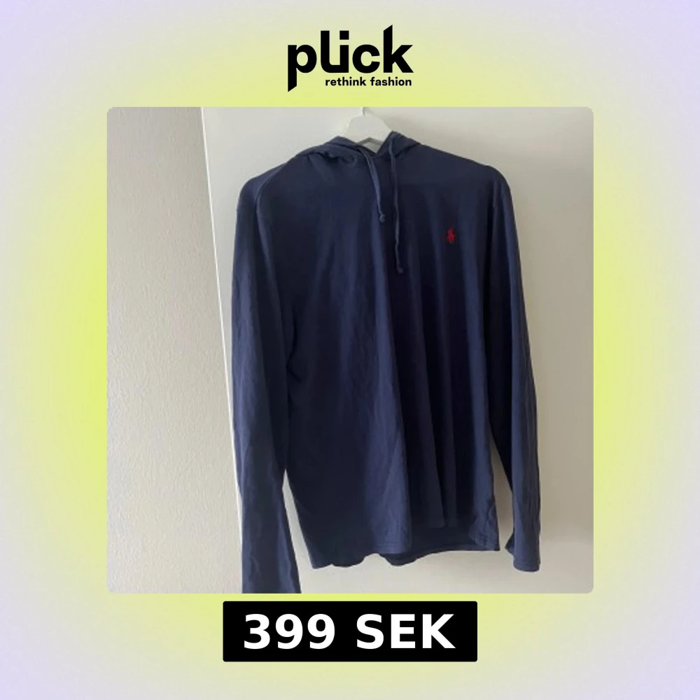 Säljer en stilren mörkblå hoodie från Polo Ralph Lauren med en liten röd logga på bröstet. Tröjan har långa ärmar. Perfekt för en avslappnad look.
