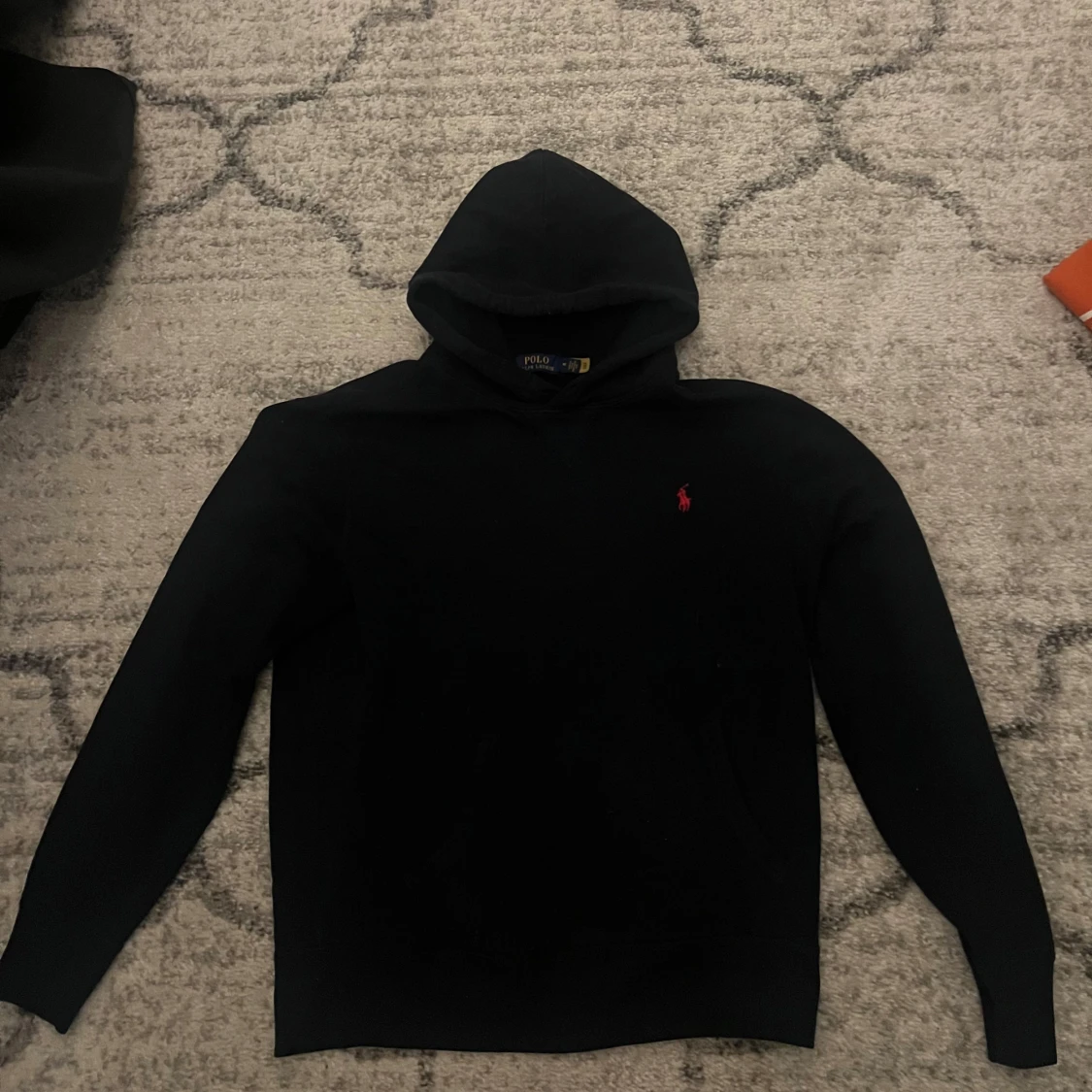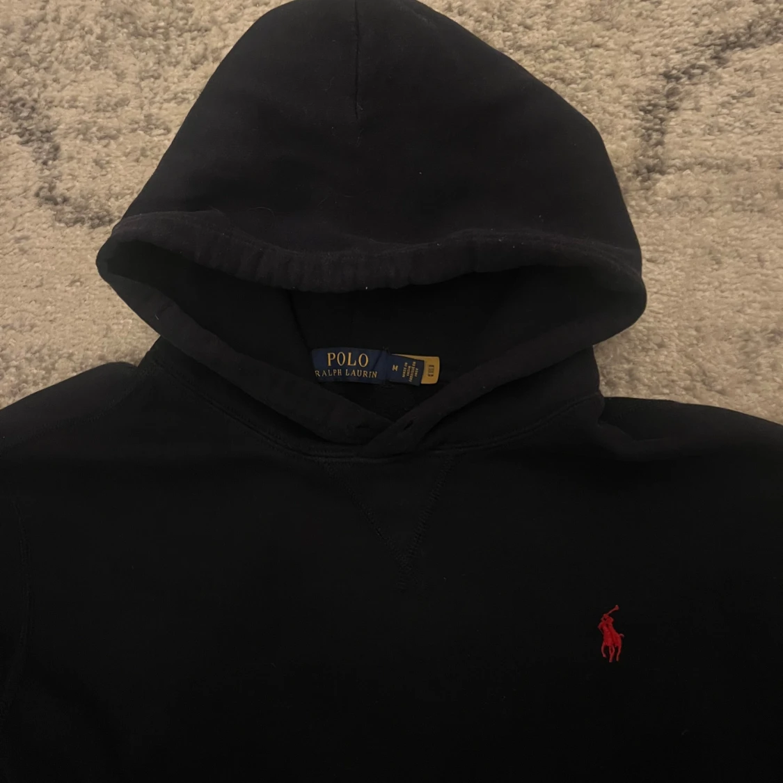 Säljer en mörkblå hoodie från Polo Ralph Lauren med klassisk röd broderad logga på bröstet. Tröjan har huva, känguruficka och långa ärmar. Perfekt för dig som gillar stilrena och tidlösa plagg.