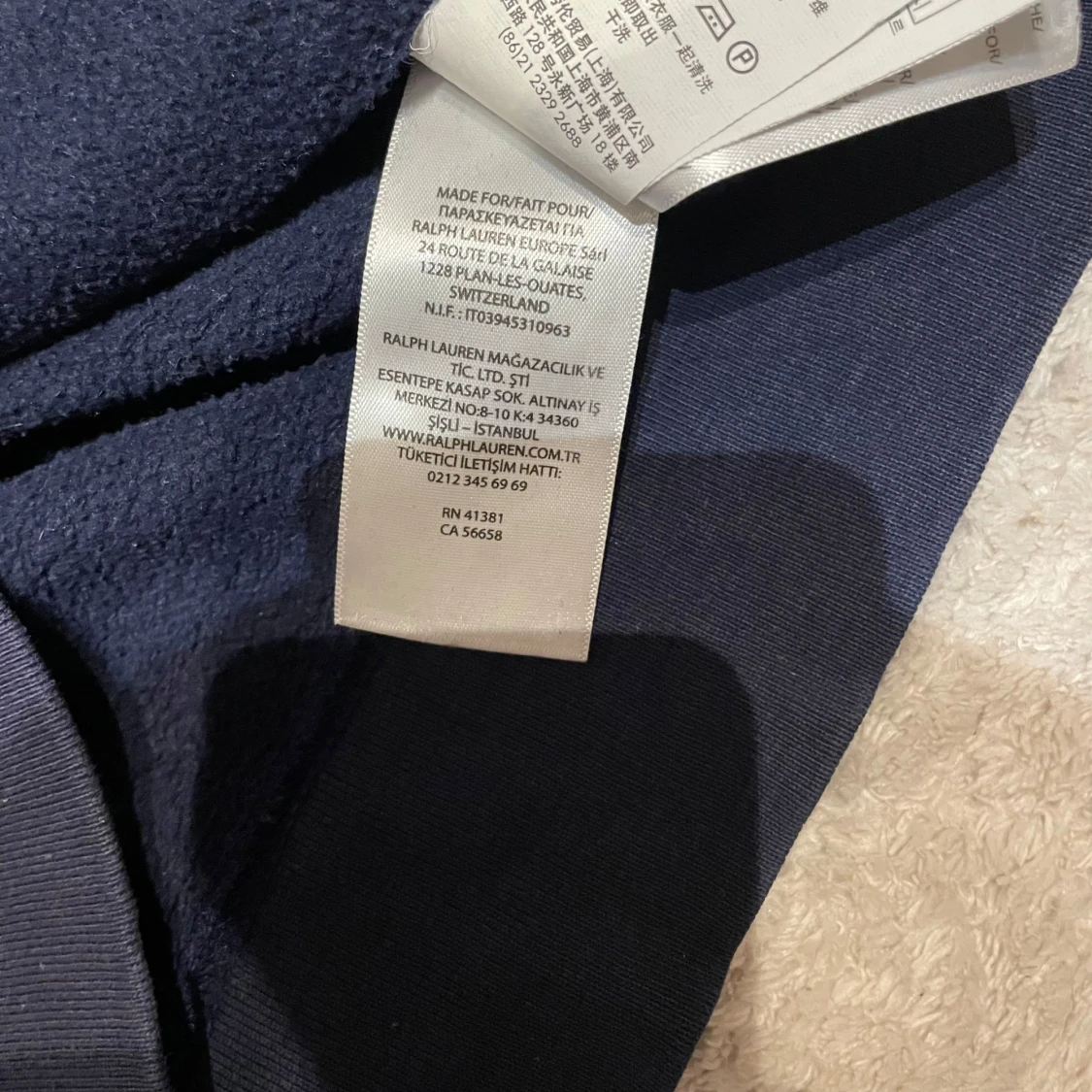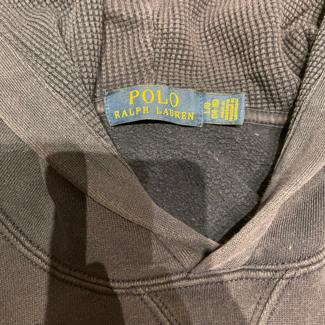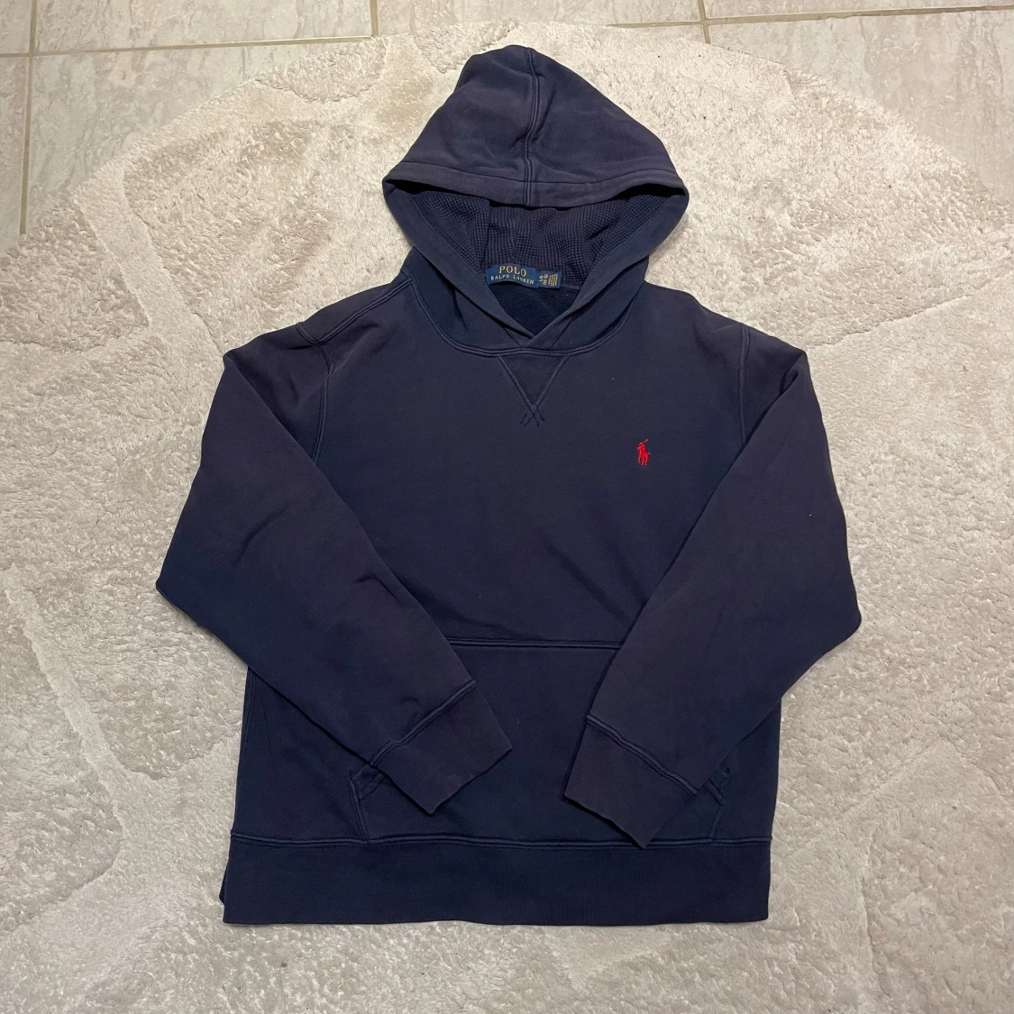 Säljer en snygg mörkblå hoodie från Polo Ralph Lauren med det klassiska röda logotypbroderiet på bröstet. Tröjan har en bekväm huva och långa ärmar, perfekt för kyliga dagar. Passar både till vardags och avslappnade tillfällen. Passar 14-16