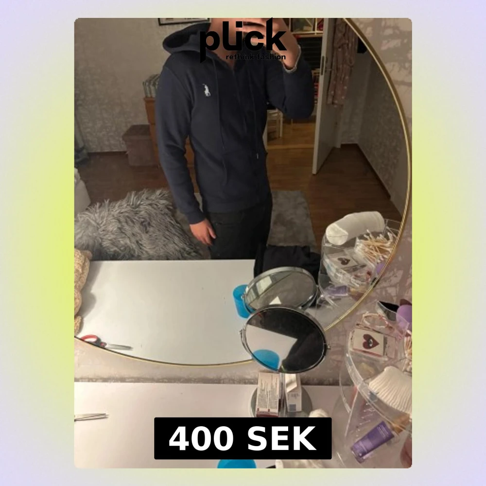 Säljer en mörkblå hoodie från Polo Ralph Lauren med vit broderad logga på bröstet. Tröjan har huva med snörning, dragkedja framtill och två fickor. Materialet är mjuk bomull och passformen är normal. Perfekt för chill dagar eller när du vill vara extra comfy.