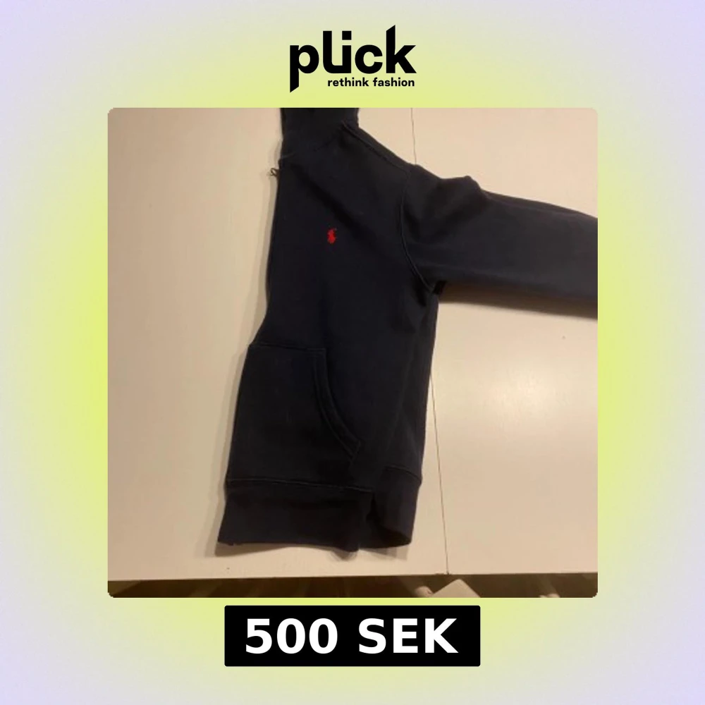 Säljer en snygg mörkblå hoodie från Ralph Lauren med dragkedja och det klassiska röda logotypbroderiet på bröstet. Perfekt för en avslappnad stil. Hoodien har långa ärmar och en praktisk ficka framtill.