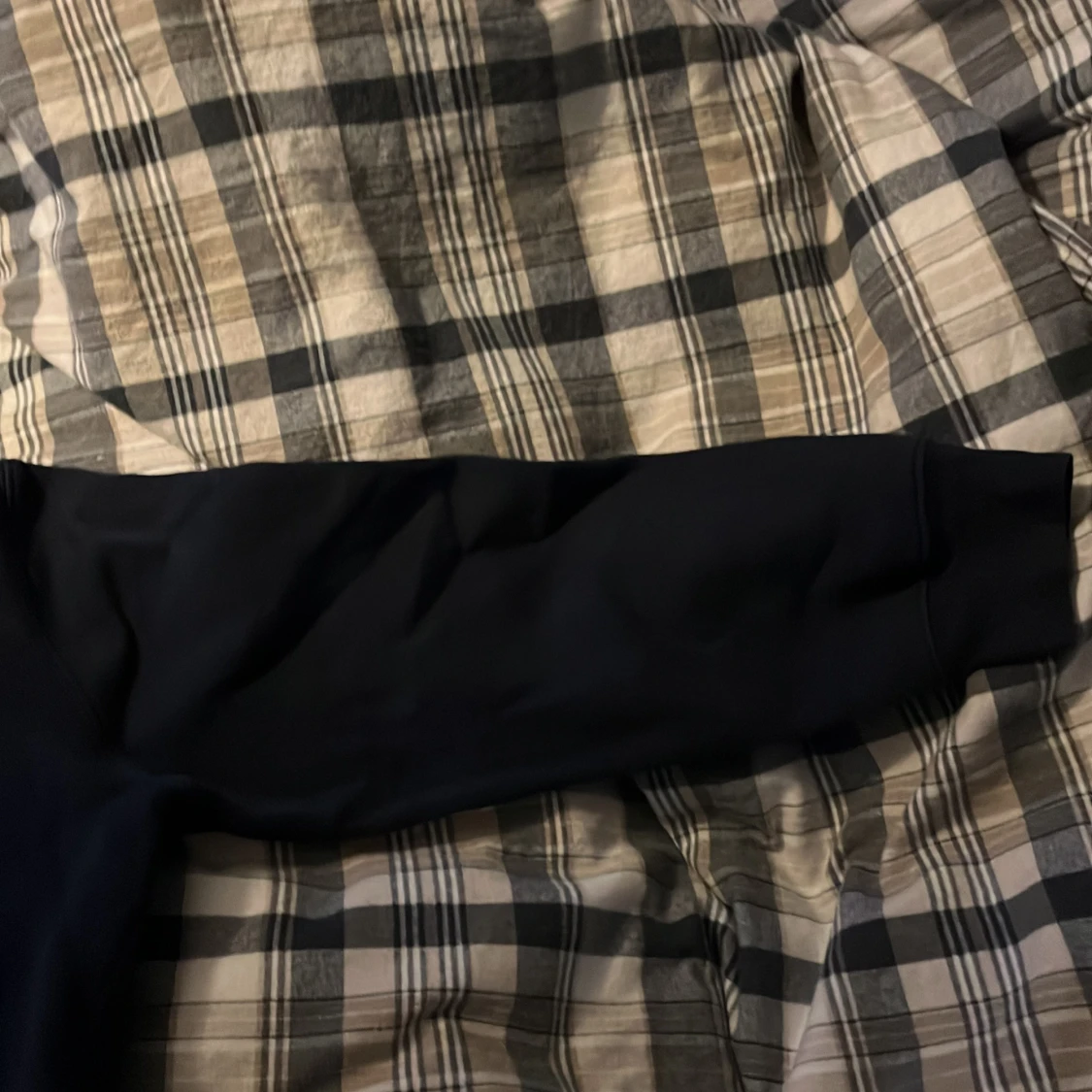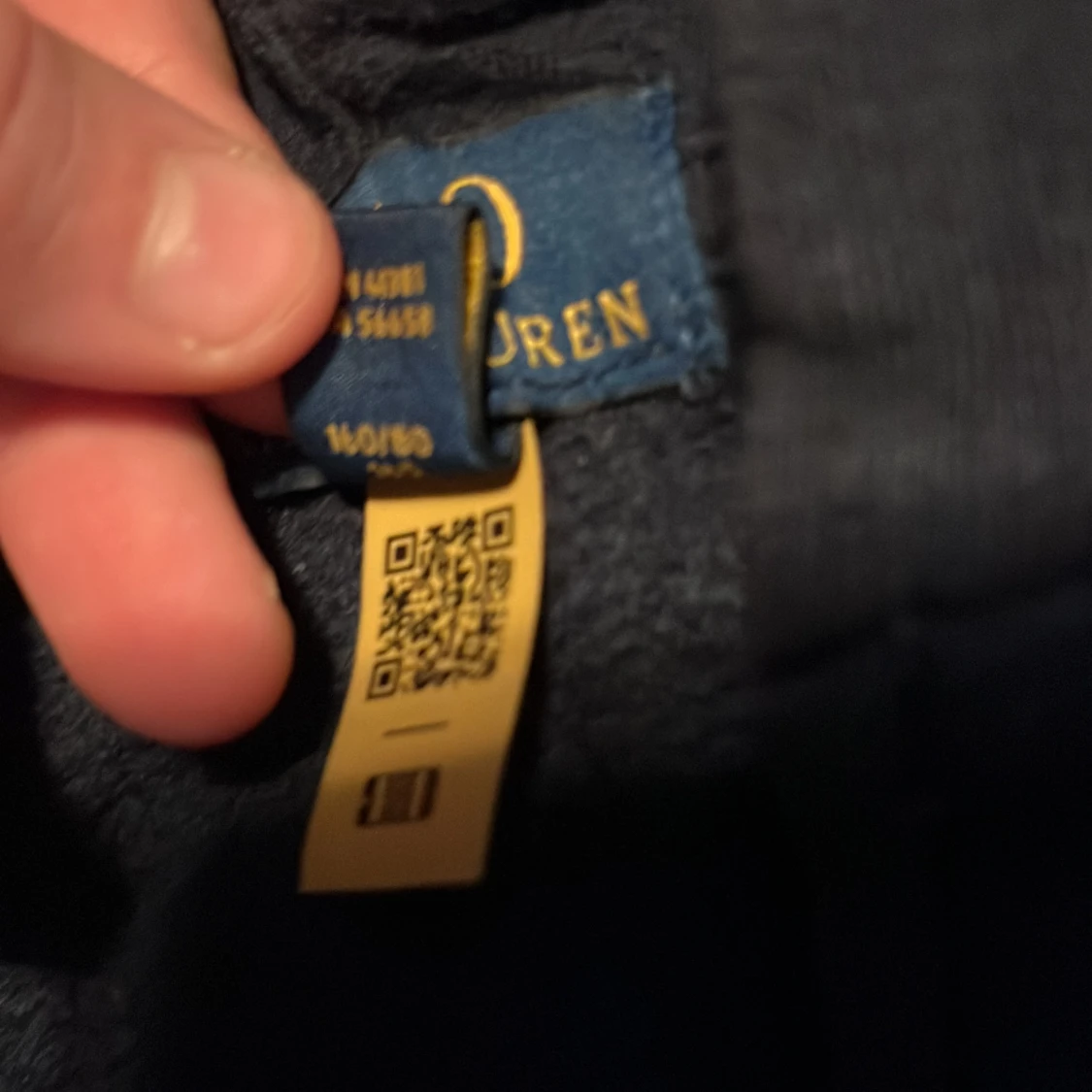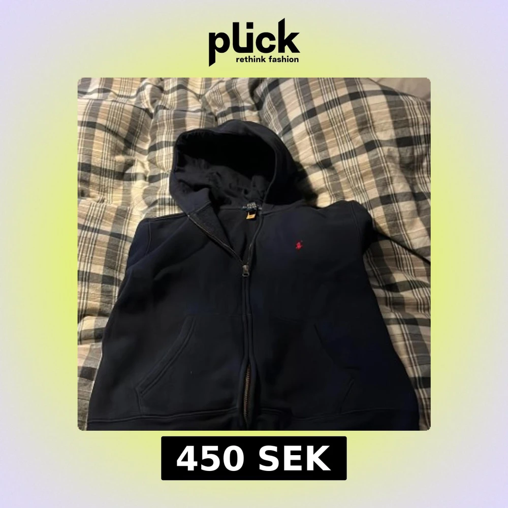 Säljer en snygg mörkblå hoodie från Ralph Lauren med dragkedja och en liten röd logga på bröstet. Perfekt för en avslappnad stil. Den har en klassisk passform med långa ärmar och en praktisk huva.