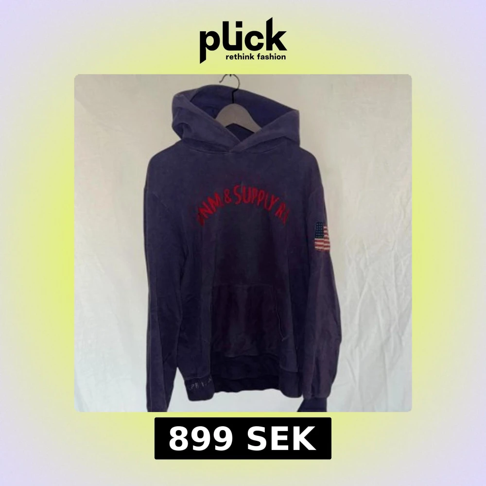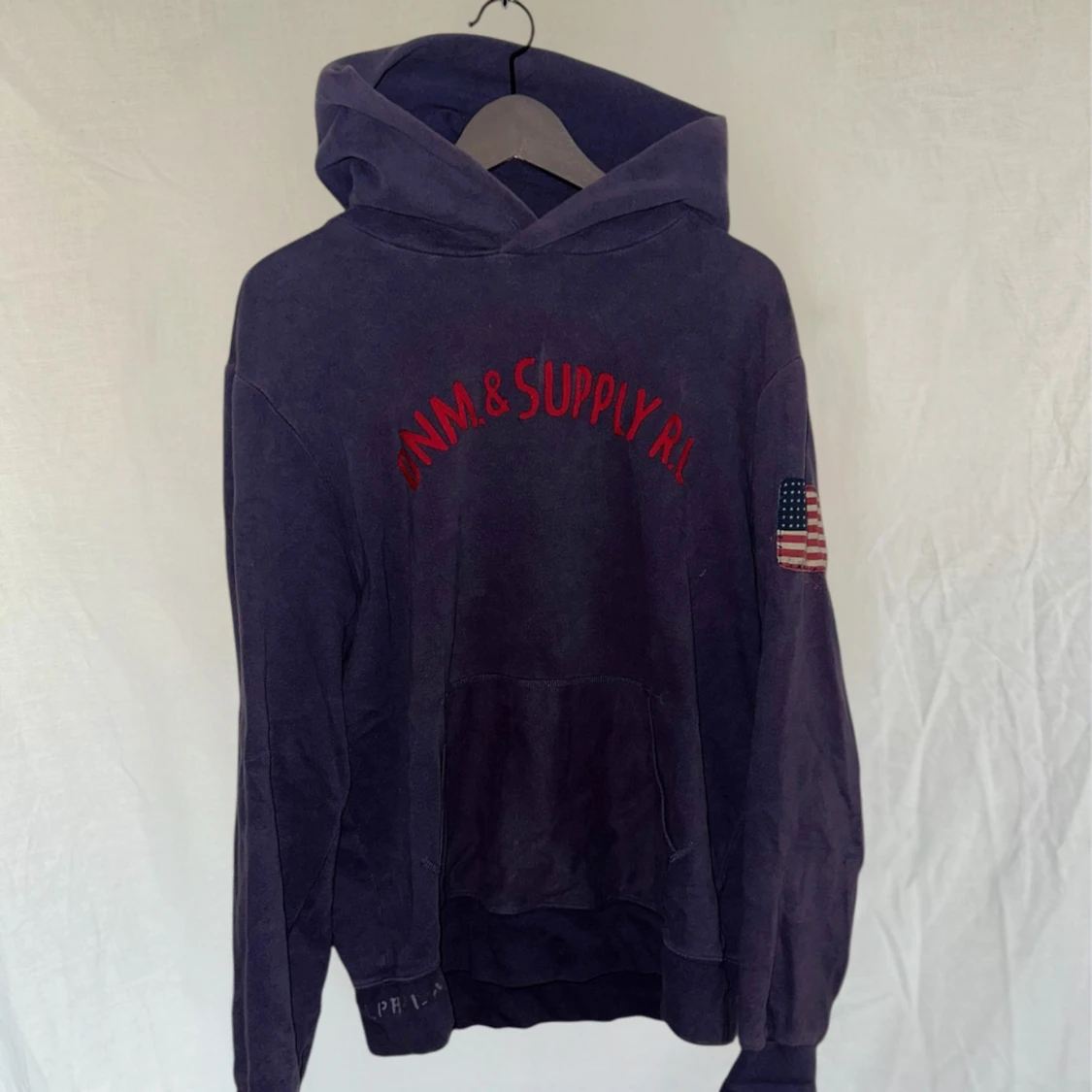 Säljer en snygg mörkblå hoodie från Ralph Lauren med röd text på bröstet och en amerikansk flagga på ärmen. Den har en klassisk känguruficka och ribbade muddar. Perfekt för en avslappnad stil. Marinblå men lite mera åt det lila hållet