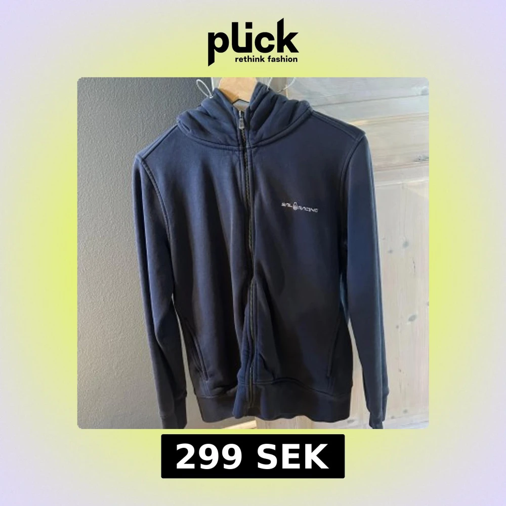 Säljer en mörkblå hoodie från Sail Racing med dragkedja framtill. Tröjan har en broderad logga på bröstet och en liten logga på huvan. Perfekt för en avslappnad stil.