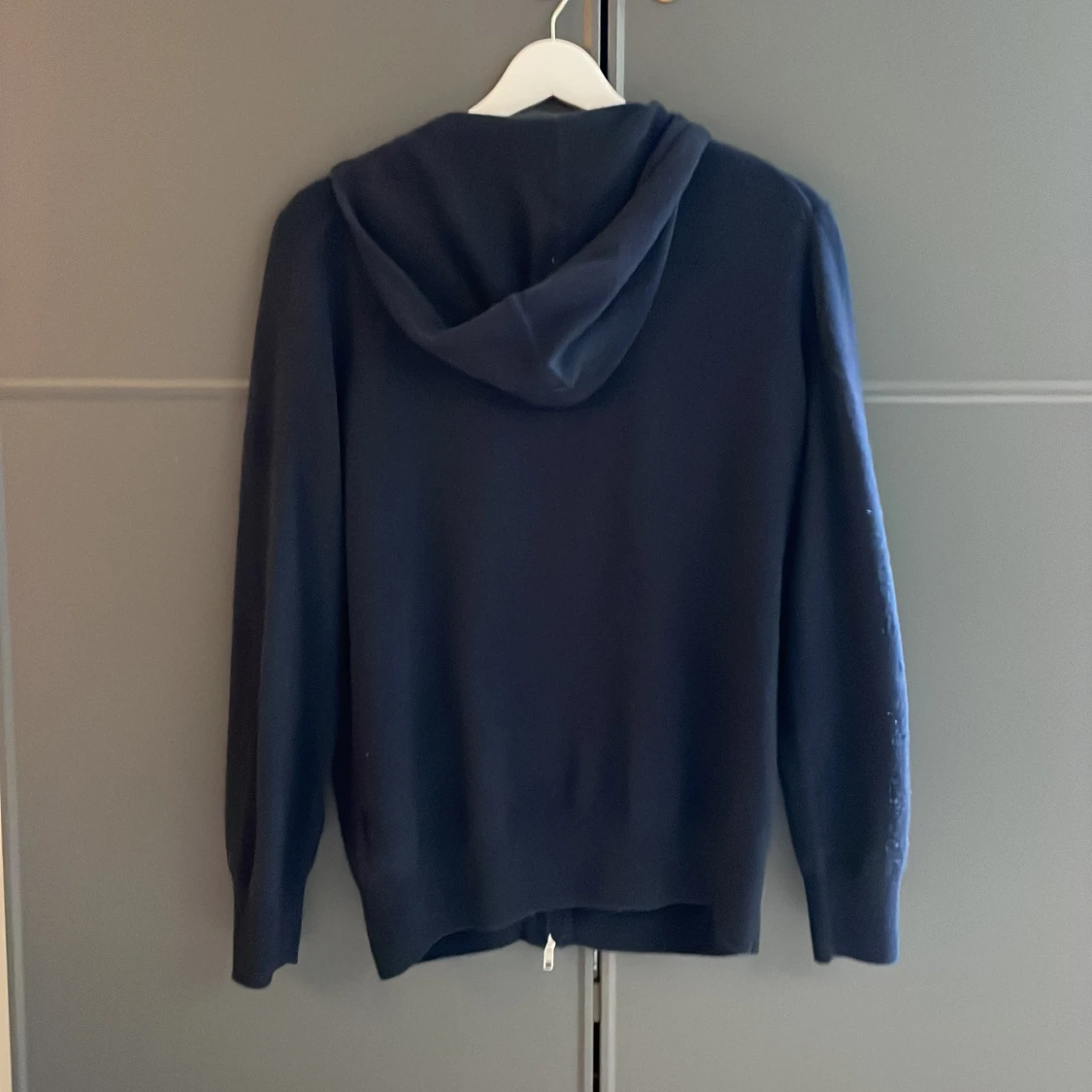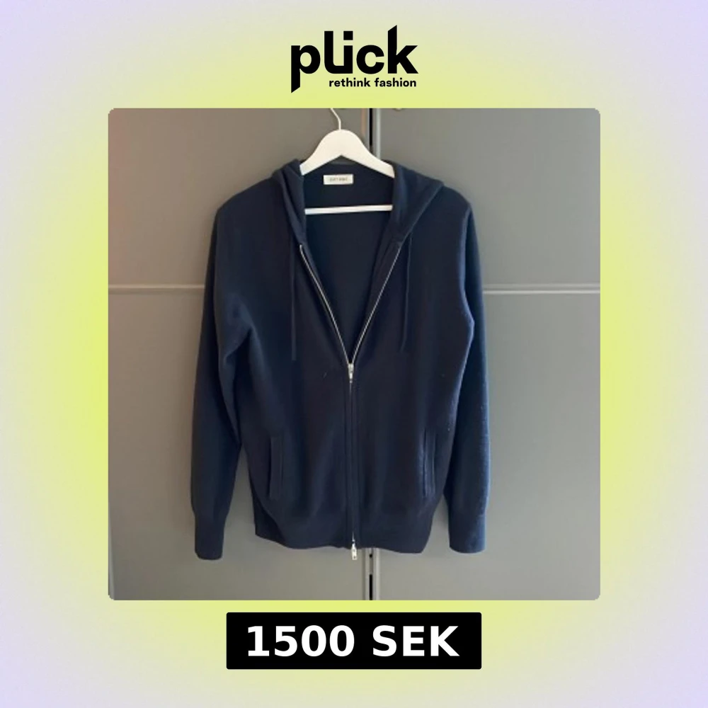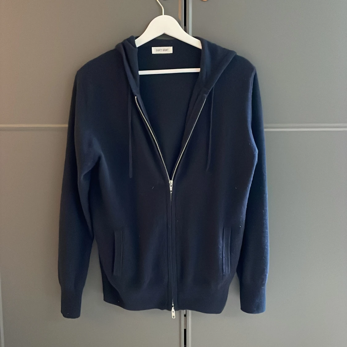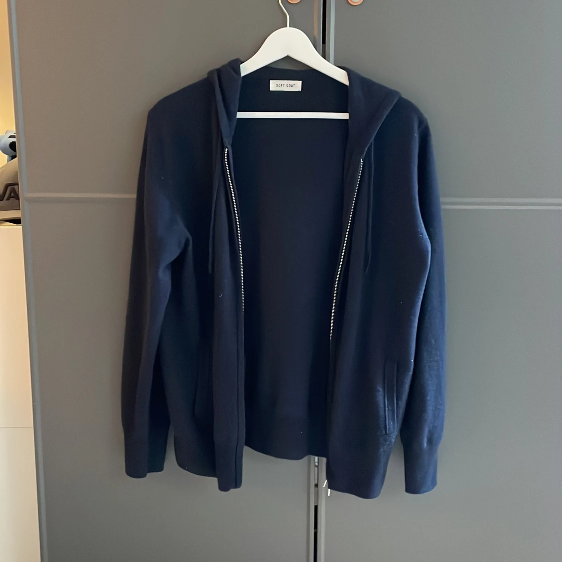 Säljer en stilren mörkblå hoodie från Soft Goat. Den har en dragkedja framtill och en bekväm huva. Perfekt för kyliga dagar. Passar både till jeans och mjukisbyxor.
