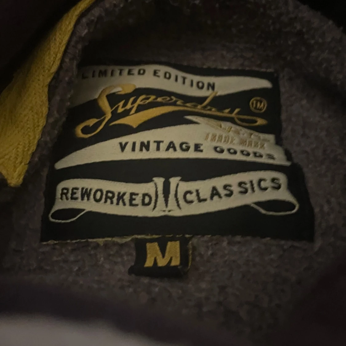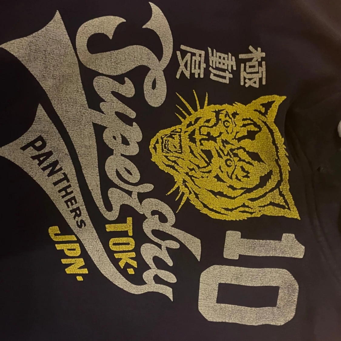Säljer en mörkblå hoodie från Superdry med en stor gul och vit tigerdesign och text på framsidan. Hoodien har en justerbar huva med vita snören och ribbade muddar vid ärmslut och nederkant. Perfekt för en avslappnad stil!